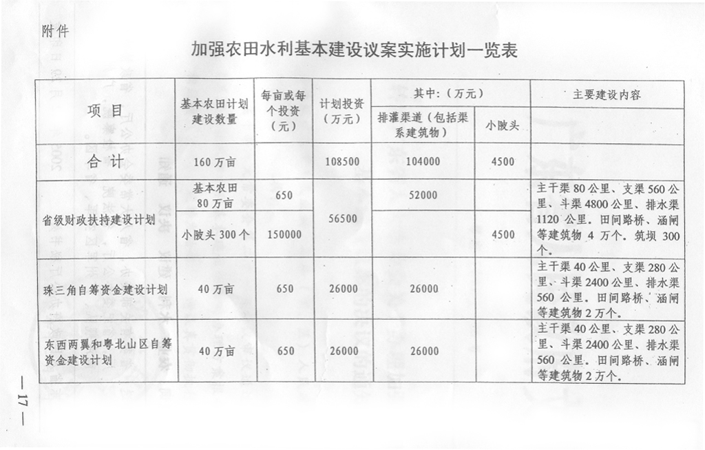 廣東省人大常委會(huì): 省十屆人大三次會(huì)議代表提出的《關(guān)于加強(qiáng)農(nóng)田水利基本建設(shè)的議案》(第0018、0019、0037、0038、0068、0070、0085、0154、0156、0195、0208、0234號(hào)),交由省人民政府辦理。2005年3月下旬,省政府組織省農(nóng)業(yè)廳、發(fā)展改革委、財(cái)政廳、國(guó)土資源廳、水利廳等有關(guān)單位,邀請(qǐng)省人大農(nóng)村農(nóng)業(yè)委員會(huì)參加,組成4個(gè)調(diào)研組,分赴廣州、汕頭、韶關(guān)、河源、梅州等17個(gè)地級(jí)以上市進(jìn)行專(zhuān)題調(diào)研。在此基礎(chǔ)上,省政府經(jīng)過(guò)反復(fù)研究,廣泛征求意見(jiàn),提出了辦理方案。現(xiàn)報(bào)告如下: 一、我省農(nóng)田水利基本建設(shè)情況和存在的主要問(wèn)題 廣東地處熱帶、亞熱帶季風(fēng)氣候區(qū),臺(tái)風(fēng)、暴雨洪澇、干旱等自然災(zāi)害頻繁發(fā)生。近年來(lái),隨著氣候變暖,全省干旱嚴(yán)重,甚至出現(xiàn)連續(xù)性和普遍性干旱。2004年全省有2/3的地級(jí)市83個(gè)縣出現(xiàn)了旱情,農(nóng)業(yè)生產(chǎn)遭到嚴(yán)重影響,據(jù)統(tǒng)計(jì),農(nóng)作物受旱面積達(dá)1000多萬(wàn)畝,旱情嚴(yán)重的粵北、粵西、粵東地區(qū)受旱面積達(dá)900多萬(wàn)畝,直接經(jīng)濟(jì)損失近40億元;晚造糧食作物受災(zāi)面積713萬(wàn)畝,其中成災(zāi)面積325萬(wàn)畝,絕收面積48萬(wàn)畝,損失糧食達(dá)40萬(wàn)噸。 廣東耕地資源稀缺,“七山一水兩分田”,人多地少。2004年末全省耕地總資源為4010萬(wàn)畝,其中常用耕地面積3161.7萬(wàn)畝,比2000年減少217萬(wàn)畝,全省人均占有耕地面積0.4畝,不到全國(guó)人均耕地?cái)?shù)量的一半,遠(yuǎn)低于聯(lián)合國(guó)糧農(nóng)組織劃定的0.8畝的警戒線。據(jù)調(diào)查分析,目前全省土地可供開(kāi)發(fā)整理補(bǔ)充耕地的總潛力為329萬(wàn)畝,其中土地整理潛力約62萬(wàn)畝,土地復(fù)墾潛力約21萬(wàn)畝,土地開(kāi)發(fā)潛力約246萬(wàn)畝,土地后備資源十分有限。隨著經(jīng)濟(jì)社會(huì)的發(fā)展和城市化進(jìn)程加快,耕地面積逐步減少不可避免。 省委、省政府歷來(lái)高度重視農(nóng)田水利基本建設(shè)工作。20世紀(jì)五六十年代重點(diǎn)進(jìn)行江海堤圍整治和修建山塘水庫(kù)治旱,修建以灌溉為主的蓄水工程;20世紀(jì)70年代以治水、改土、增肥為中心,實(shí)行山、水、田、林、路綜合治理。十一屆三中全會(huì)后,特別是近幾年來(lái),全省各地加大投入力度,大力開(kāi)展農(nóng)田水利基本建設(shè)。各地結(jié)合現(xiàn)代化農(nóng)業(yè)示范區(qū)、農(nóng)業(yè)綜合開(kāi)發(fā)、商品糧基地和改造中低產(chǎn)田等項(xiàng)目的實(shí)施,建設(shè)了一批高產(chǎn)穩(wěn)產(chǎn)農(nóng)田,增強(qiáng)農(nóng)田抗災(zāi)能力和農(nóng)業(yè)綜合生產(chǎn)能力,提高了農(nóng)作物產(chǎn)量和耕地復(fù)種指數(shù),對(duì)保護(hù)和提高糧食生產(chǎn)能力,促進(jìn)農(nóng)業(yè)和農(nóng)村經(jīng)濟(jì)發(fā)展,增加農(nóng)民收入起到了重要的作用。據(jù)統(tǒng)計(jì),2001—2004年全省累計(jì)建設(shè)高產(chǎn)穩(wěn)產(chǎn)農(nóng)田220萬(wàn)畝,改造中低產(chǎn)田142萬(wàn)畝,新增旱澇保收面積100萬(wàn)畝,新增灌溉面積220萬(wàn)畝,改善灌溉面積245萬(wàn)畝,新增除澇面積33萬(wàn)畝。 我省農(nóng)田水利基本建設(shè)雖然有一定發(fā)展,但仍不能適應(yīng)新時(shí)期農(nóng)村社會(huì)經(jīng)濟(jì)發(fā)展的需要,目前存在的主要問(wèn)題有: (一)對(duì)農(nóng)田水利基本建設(shè)工作認(rèn)識(shí)不足,資金投入少。多年來(lái),部分地方政府和有關(guān)部門(mén)對(duì)加強(qiáng)農(nóng)田水利基礎(chǔ)設(shè)施建設(shè)的重要性和緊迫性認(rèn)識(shí)不足,沒(méi)有真正把加強(qiáng)農(nóng)田水利基礎(chǔ)設(shè)施建設(shè)作為提高農(nóng)業(yè)綜合生產(chǎn)能力、確保糧食安全和增加農(nóng)民收入的一項(xiàng)重要措施,擺上政府工作的議事日程。在資金投入上,注重大江大河治理等大型水利工程建設(shè),忽視對(duì)小型農(nóng)田水利基礎(chǔ)設(shè)施的建設(shè)。除廣州、佛山、東莞、中山等少部分地區(qū)外,地方各級(jí)財(cái)政投入農(nóng)田水利基本建設(shè)的資金十分有限。農(nóng)村稅費(fèi)改革后取消“兩工”和實(shí)施“一事一議”,農(nóng)田水利基本建設(shè)資金籌措難度加大,投入資金呈遞減趨勢(shì),跟不上農(nóng)業(yè)發(fā)展的需要。 (二)農(nóng)田水利基礎(chǔ)設(shè)施老化失修,抗災(zāi)能力差。目前全省的農(nóng)田水利基礎(chǔ)設(shè)施大多數(shù)是20世紀(jì)六七十年代興建的,排灌渠道以坭渠為主,經(jīng)過(guò)長(zhǎng)期使用,大量農(nóng)田水利設(shè)施老化、失修,渠道滲漏、堵塞嚴(yán)重,導(dǎo)致灌溉效益不斷衰減,有效灌溉面積下降,易旱易澇耕地面積加大。據(jù)統(tǒng)計(jì),2004年全省農(nóng)田有效灌溉面積1968萬(wàn)畝,占全省耕地面積的62%,比1990年下降9個(gè)百分點(diǎn);易旱易澇面積1500萬(wàn)畝,占全省耕地面積的四成多;渠系水利用系數(shù)僅為0.3-0.4,水資源浪費(fèi)嚴(yán)重。 (三)耕地質(zhì)量下降,中低產(chǎn)田面積大。由于長(z