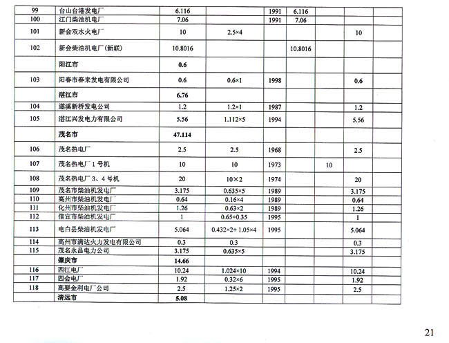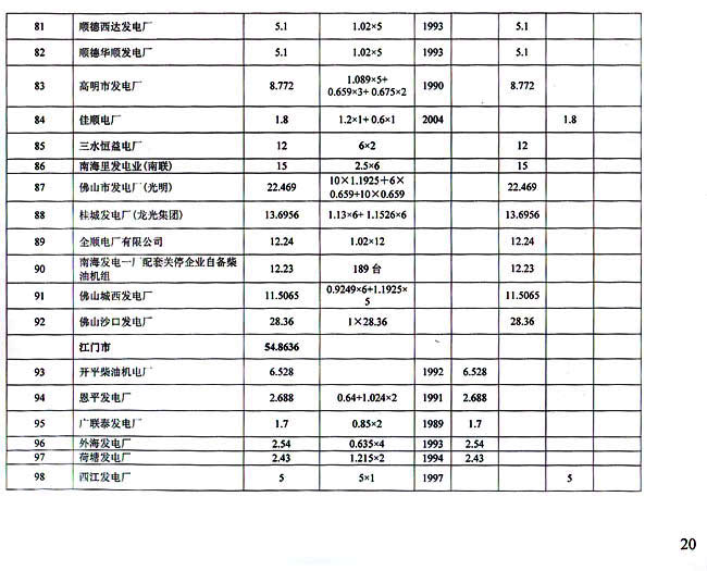 注:本表所列關(guān)停機(jī)組包括四個(gè)部分:一是國(guó)家發(fā)展改革委與省政府簽訂的廣東省“十一五”期間關(guān)停小火電機(jī)組責(zé)任書(shū)中的機(jī)組。經(jīng)進(jìn)一步核實(shí),該責(zé)任書(shū)中,中山小欖發(fā)電廠與中山市菊明電力有限公司系同一項(xiàng)目;永寧發(fā)電廠與中山市永潤(rùn)電力有限公司系同一項(xiàng)目;江門(mén)發(fā)電廠與江門(mén)柴油機(jī)廠系同一項(xiàng)目,屬重復(fù)計(jì)算。鑒此,本表中相應(yīng)剔除了前者,共計(jì)調(diào)減容量8.38萬(wàn)千瓦。二是補(bǔ)列已經(jīng)納入“上大壓小”電源項(xiàng)目配套關(guān)停但未列入責(zé)任書(shū)的中山市正業(yè)中糖熱電廠1.2萬(wàn)千瓦。三是核實(shí)機(jī)組銘牌容量后調(diào)增容量4.3萬(wàn)千瓦。四是根據(jù)佛山市、省粵電集團(tuán)公司提出增加關(guān)停小火電機(jī)組規(guī)模、相應(yīng)實(shí)施“上大壓小”電源項(xiàng)目建設(shè)的要求,增加關(guān)停佛山市的佛山沙口發(fā)電廠28.36萬(wàn)千瓦、佛山城西發(fā)電廠11.14萬(wàn)千瓦;茂名市的茂名熱電廠#1、#3、#4號(hào)機(jī)(3×10萬(wàn)千瓦),合計(jì)增加容量69.5萬(wàn)千瓦。經(jīng)上述調(diào)整之后,全省“十一五”期間關(guān)?;痣姍C(jī)組總?cè)萘繛?66萬(wàn)千瓦。