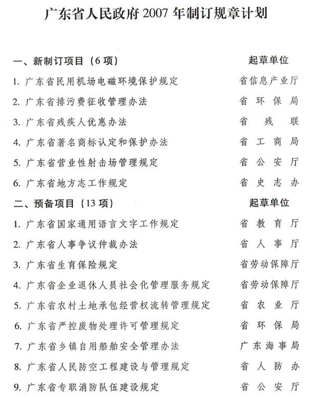 關(guān)于印發(fā)廣東省人民政府2007年制訂規(guī)章計劃的通知