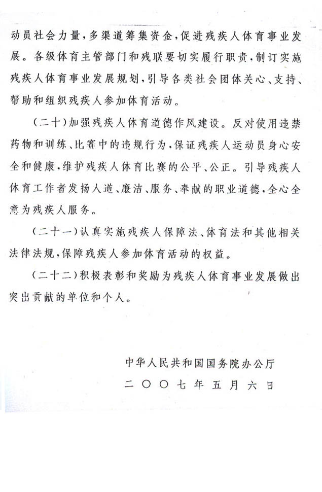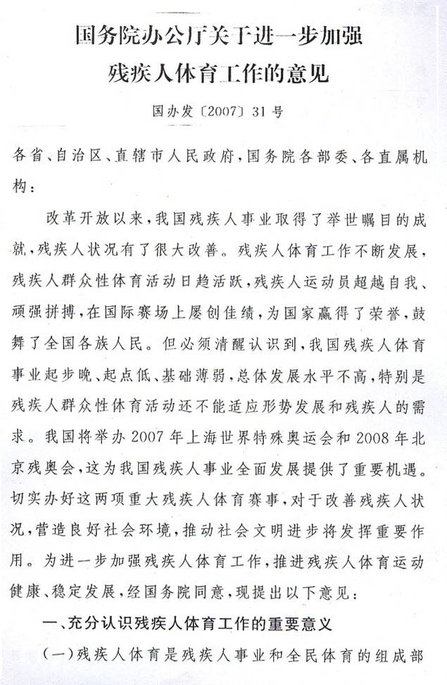 現(xiàn)將《國務院辦公廳關于進一步加強殘疾人體育工作的意見》(國辦發(fā)〔2007〕31號)轉發(fā)給你們,請認真貫徹執(zhí)行。