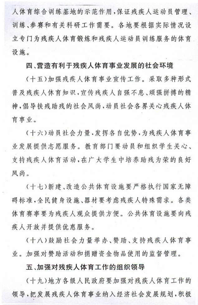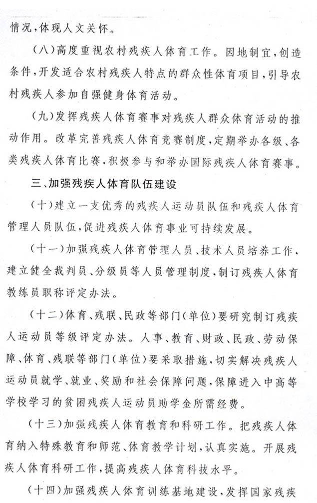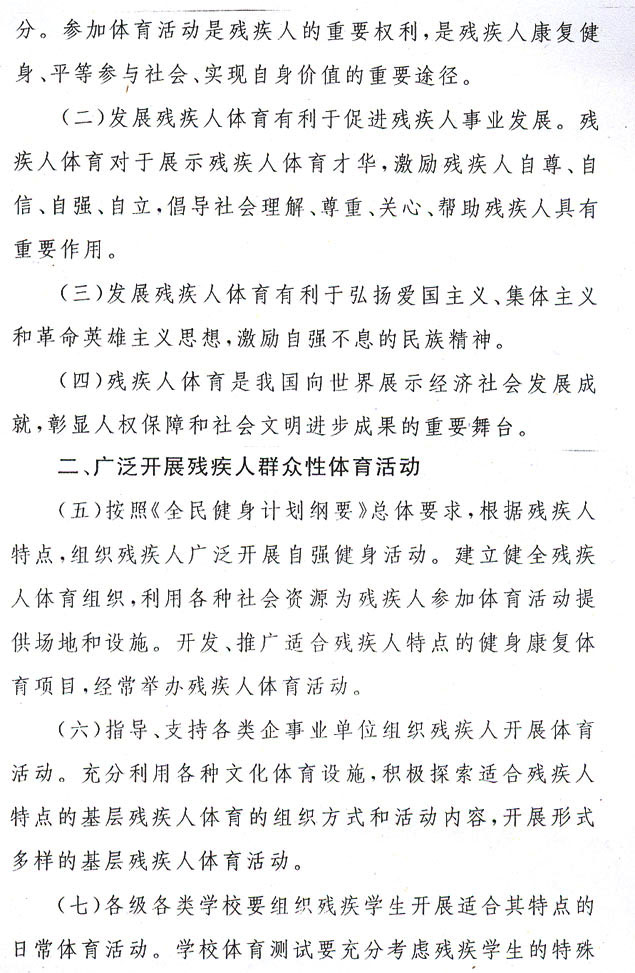 近年來,我省殘疾人體育工作發(fā)展迅速,殘疾人群眾性體育活動日趨活躍,殘疾人競技體育水平不斷提高,殘疾人運動員在國際、國內賽場屢創(chuàng)佳績,為國家、為我省贏得了榮譽。但總體而言,我省殘疾人體育事業(yè)起步晚、起點低、基礎薄弱,整體發(fā)展水平仍不高,特別是殘疾人競技體育水平與部分兄弟省相比還有較大的差距,與我省經(jīng)濟社會發(fā)展水平和建設體育強省的要求不相適應。為此,省人民政府要求,各地、各有關部門要進一步提高認識,以備戰(zhàn)2007年世界特殊奧運會、2008年殘奧會、2010年亞洲殘運會為契機,把殘疾人體育納入體育事業(yè)發(fā)展規(guī)劃,加大經(jīng)費投入,加強殘疾人體育訓練基地建設和人才隊伍建設,加快殘疾人體育項目發(fā)展,廣泛深入開展殘疾人康復健身和體育健身活動,推動我省殘疾人體育工作邁上新臺階,促進我省殘疾人體育工作與經(jīng)濟社會及殘疾人事業(yè)協(xié)調發(fā)展。