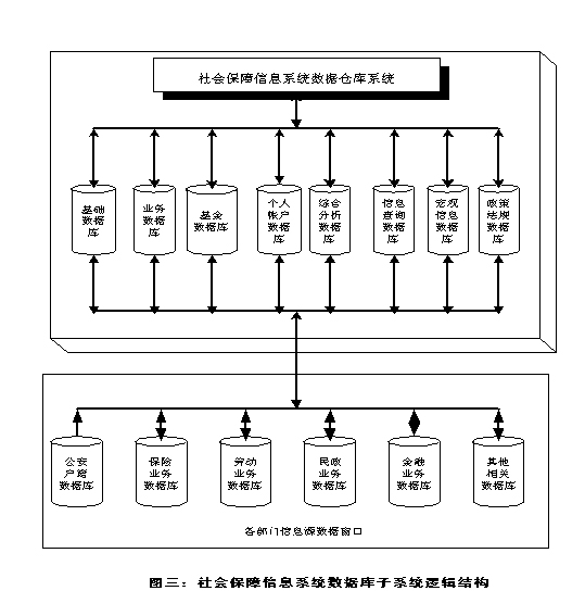 ?。ㄈ┫到y(tǒng)數(shù)據(jù)倉(cāng)庫(kù) 社會(huì)保障信息系統(tǒng)數(shù)據(jù)倉(cāng)庫(kù)是一個(gè)統(tǒng)一的、綜合的、分布式的大型數(shù)據(jù)倉(cāng)庫(kù), 它主要包括基礎(chǔ)數(shù)據(jù)庫(kù)、社會(huì)保障業(yè)務(wù)數(shù)據(jù)庫(kù)、基金數(shù)據(jù)庫(kù)、個(gè)人帳戶(hù)數(shù)據(jù)庫(kù)、 綜合分析數(shù)據(jù)庫(kù)、查詢(xún)數(shù)據(jù)庫(kù)、宏觀數(shù)據(jù)庫(kù)、政策法規(guī)等八大數(shù)據(jù)庫(kù)系統(tǒng)。數(shù)據(jù) 倉(cāng)庫(kù)系統(tǒng)構(gòu)成如圖三所示。 |