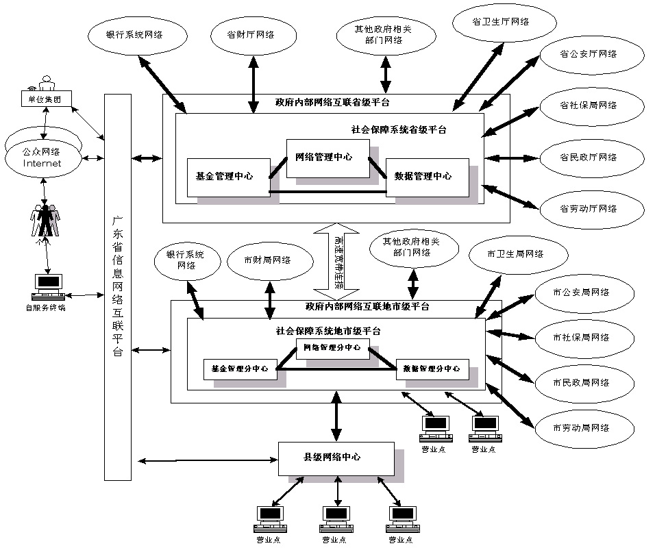 ?。ㄋ模┫到y(tǒng)網(wǎng)絡(luò)結(jié)構(gòu) 社會(huì)保障信息系統(tǒng)的網(wǎng)絡(luò)以我省建立的全省統(tǒng)一網(wǎng)絡(luò)互聯(lián)大平臺(tái)為基礎(chǔ),在 省、市級(jí)分別以政府信息網(wǎng)絡(luò)平臺(tái)為核心,通過(guò)公共通信設(shè)施連接到各有關(guān)部門(mén)。 在公共服務(wù)方面,充分利用各個(gè)公眾信息網(wǎng)絡(luò)和INTERNET資源。網(wǎng)絡(luò)結(jié) 構(gòu)如圖四所示。 |