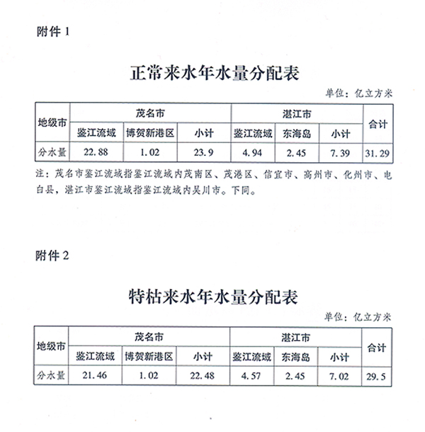 ?。ǘ┓峙浞秶?。鑒江流域水資源分配范圍為我省鑒江流域供水所涉及的行政區(qū)域,包括茂名市和湛江市。其中,茂名市包括鑒江流域內(nèi)茂南區(qū)、茂港區(qū)、信宜市、高州市、化州市、電白縣和流域外博賀新港區(qū);湛江市包括鑒江流域內(nèi)吳川市和流域外東海島。