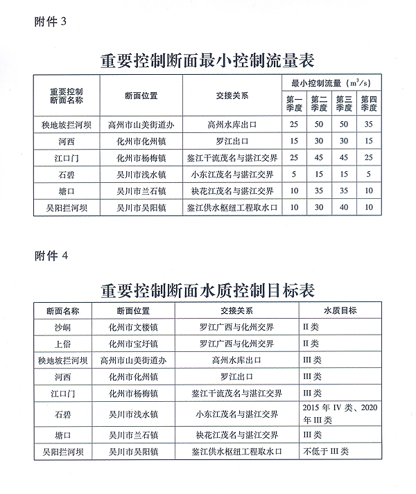 (三)分配總體要求。在確保河道內(nèi)生態(tài)基本需水、全面節(jié)水和充分利用非常規(guī)水源的前提下,以廣東省境內(nèi)鑒江流域水資源可分配量為對(duì)象,按照防洪、供水、發(fā)電的順序優(yōu)化水庫(kù)、梯級(jí)群調(diào)度,確定正常來水年(來水保證率90%以下)和特枯來水年(來水保證率在90%-95%之間,不含90%)情況下茂名和湛江兩市取水量分配指標(biāo);以落實(shí)水資源分配方案、協(xié)調(diào)河道內(nèi)外用水、保障供水安全為目標(biāo),確定重要控制斷面最小下泄流量指標(biāo);以水功能區(qū)水質(zhì)達(dá)標(biāo)為目的,確定各控制斷面水質(zhì)管理控制指標(biāo)。