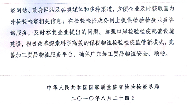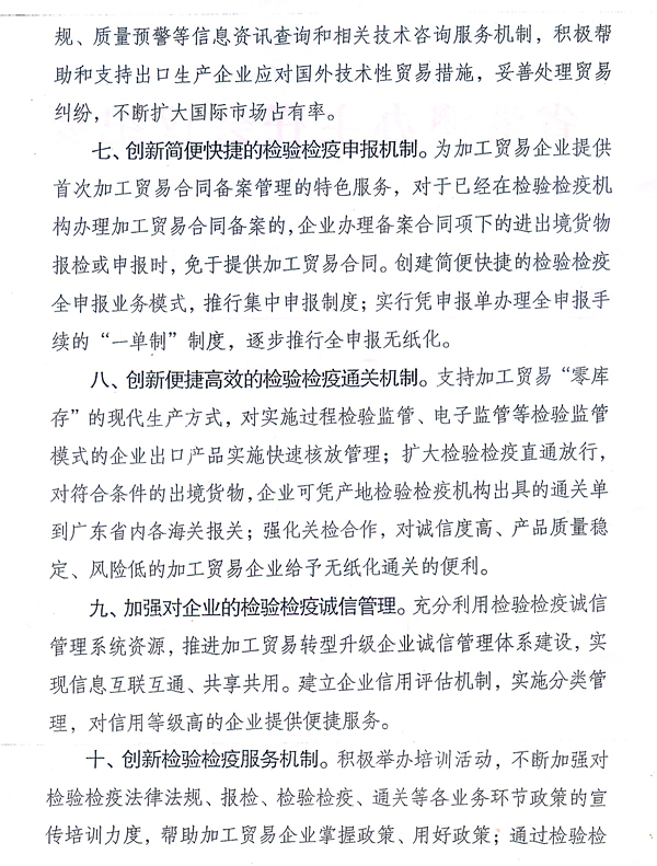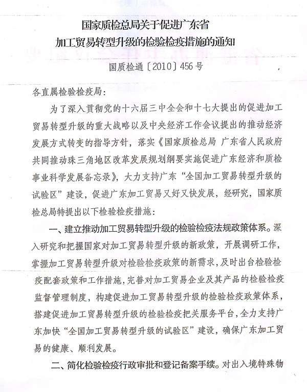 各地級(jí)以上市人民政府,省政府各部門、各直屬機(jī)構(gòu): 近日,國家質(zhì)檢總局根據(jù)廣東出入境檢驗(yàn)檢疫局調(diào)研意見,出臺(tái)了《國家質(zhì)檢總局關(guān)于促進(jìn)廣東省加工貿(mào)易轉(zhuǎn)型升級(jí)的檢驗(yàn)檢疫措施的通知》(國質(zhì)檢通〔2010〕456號(hào)),支持我省建設(shè)全國加工貿(mào)易轉(zhuǎn)型升級(jí)試驗(yàn)區(qū)。根據(jù)省政府領(lǐng)導(dǎo)意見,現(xiàn)將國質(zhì)檢通〔2010〕456號(hào)文轉(zhuǎn)發(fā)給你們,請(qǐng)認(rèn)真組織學(xué)習(xí)宣傳,配合做好相關(guān)工作。同時(shí),各地、各部門要借鑒國家質(zhì)檢總局和廣東出入境檢驗(yàn)檢疫局的做法,積極采取有效措施,為加工貿(mào)易企業(yè)轉(zhuǎn)型升級(jí)提供優(yōu)質(zhì)、高效的服務(wù)。