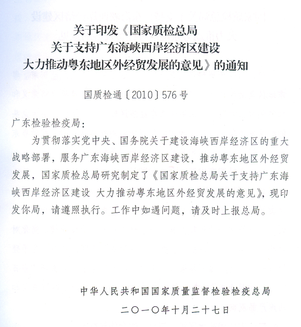 各地級以上市人民政府,省政府各部門、各直屬機(jī)構(gòu): 近日,國家質(zhì)檢總局根據(jù)廣東出入境檢驗檢疫局調(diào)研意見,印發(fā)了《國家質(zhì)檢總局關(guān)于支持廣東海峽西岸經(jīng)濟(jì)區(qū)建設(shè)大力推動粵東地區(qū)外經(jīng)貿(mào)發(fā)展的意見》(國質(zhì)檢通〔2010〕576號)。根據(jù)省政府領(lǐng)導(dǎo)意見,現(xiàn)將國質(zhì)檢通〔2010〕576號文轉(zhuǎn)發(fā)給你們,請認(rèn)真組織學(xué)習(xí)宣傳?;洊|地區(qū)各市和省各部門要積極支持和配合出入境檢驗檢疫部門做好相關(guān)工作,并借鑒國家質(zhì)檢總局和廣東出入境檢驗檢疫局的做法,采取有效措施,加快粵東地區(qū)外經(jīng)貿(mào)發(fā)展,充分發(fā)揮外經(jīng)貿(mào)對經(jīng)濟(jì)社會又好又快發(fā)展的拉動作用,為順利實現(xiàn)省委、省政府提出的粵東地區(qū)“五年大變化”目標(biāo)作出新的更大的貢獻(xiàn)。 廣東省人民政府辦公廳 二○一○年十一月二十四日