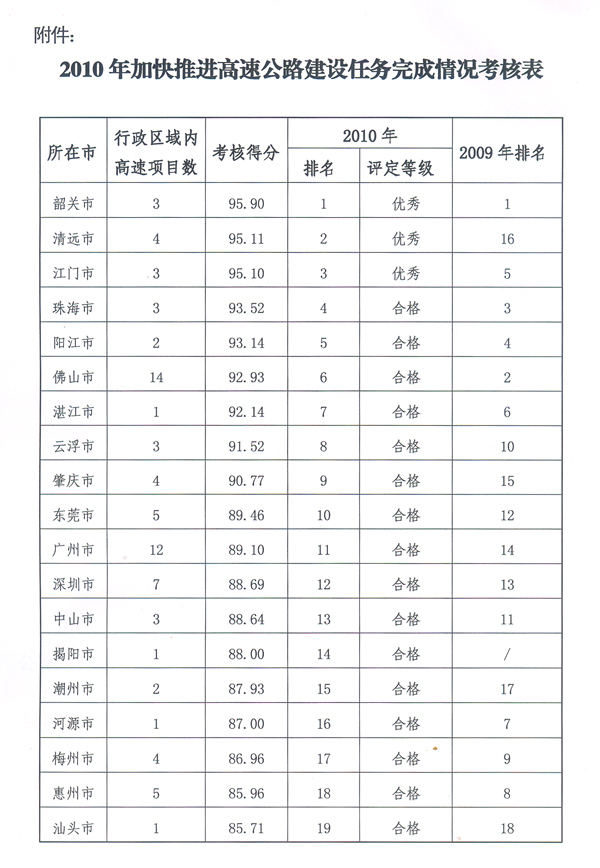 關(guān)于2010年我省高速公路建設(shè) 目標(biāo)任務(wù)完成情況的通報(bào) ? 各地級(jí)以上市人民政府,各縣(市、區(qū))人民政府,省政府各部門、各直屬機(jī)構(gòu): 2010年,各地、各有關(guān)部門和各高速公路項(xiàng)目業(yè)主單位按照省委、省政府決策部署,搶抓機(jī)遇,加快以高速公路為“龍頭”的交通基礎(chǔ)設(shè)施建設(shè),高速公路通車?yán)锍倘〉昧藲v史性的突破,“十一五”規(guī)劃建設(shè)任務(wù)圓滿完成,為應(yīng)對(duì)國(guó)際金融危機(jī)沖擊,保持全省經(jīng)濟(jì)社會(huì)平穩(wěn)較快發(fā)展作出了積極貢獻(xiàn)。有關(guān)情況通報(bào)如下: 一、高速公路項(xiàng)目建設(shè)總體進(jìn)展情況 (一)全年高速公路建設(shè)目標(biāo)順利完成。2010年全省高速公路建設(shè)完成投資493億元,為年度計(jì)劃的103%,同比增長(zhǎng)33.4%。加快推進(jìn)續(xù)建高速公路項(xiàng)目33項(xiàng)(35段)共1974公里,新開工項(xiàng)目11項(xiàng)共535公里,順利建成了二廣高速公路懷集至三水段、韶贛高速公路、湛徐高速公路和陽陽高速公路等14個(gè)項(xiàng)目共800公里,南雄、仁化、始興、雷州、徐聞、廣寧、懷集和陽春等8縣(市)實(shí)現(xiàn)通高速公路目標(biāo),全省通高速公路縣(市)達(dá)54個(gè),通達(dá)率80.6%。重點(diǎn)建設(shè)項(xiàng)目的關(guān)鍵環(huán)節(jié)任務(wù)基本按照《2010年度廣東省加快推進(jìn)高速公路重點(diǎn)建設(shè)項(xiàng)目關(guān)鍵環(huán)節(jié)責(zé)任目標(biāo)分解》(以下稱《責(zé)任表》)的要求完成。全省高速公路通車?yán)锍掏黄?800公里。 (二)項(xiàng)目核準(zhǔn)和用地報(bào)批工作穩(wěn)步推進(jìn)。各地、各有關(guān)部門認(rèn)真落實(shí)“綠色通道”和“并聯(lián)審批”制度,積極與國(guó)家相關(guān)部門匯報(bào)溝通,全力加快項(xiàng)目核準(zhǔn)、用地報(bào)批等工作,用地獲批數(shù)量創(chuàng)歷年之最。截至2010年底,羅陽高速公路、二廣高速公路連州至懷集段、江番高速公路及江珠高速公路北延線、潮惠高速公路等10個(gè)高速公路項(xiàng)目獲得核準(zhǔn);湛徐高速公路、增從高速公路、陽陽高速公路、江肇高速公路、廣樂高速公路韶關(guān)段等16項(xiàng)(19段)共1007公里整體用地獲得批復(fù)。 (三)征地拆遷工作取得較大進(jìn)展。高速公路建設(shè)項(xiàng)目沿線各級(jí)政府切實(shí)承擔(dān)征地拆遷主體責(zé)任,按照《責(zé)任表》時(shí)限要求,加快推進(jìn)征地拆遷工作,對(duì)嚴(yán)重制約高速公路建設(shè)的重點(diǎn)難點(diǎn)問題加強(qiáng)現(xiàn)場(chǎng)督辦,落實(shí)問責(zé)制度。韶關(guān)、清遠(yuǎn)、江門、珠海、陽江、佛山、湛江等地各級(jí)政府及各參建單位上下聯(lián)動(dòng),力促2010年計(jì)劃建成通車項(xiàng)目的征地拆遷工作取得突破性進(jìn)展,為項(xiàng)目如期完工創(chuàng)造了條件。 根據(jù)《廣東省加快重點(diǎn)交通基礎(chǔ)設(shè)施建設(shè)獎(jiǎng)懲激勵(lì)辦法(試行)》規(guī)定,省有關(guān)部門對(duì)2010年全省高速公路建設(shè)目標(biāo)任務(wù)完成情況進(jìn)行了考核,其中韶關(guān)、清遠(yuǎn)和江門3市在落實(shí)高速公路重點(diǎn)項(xiàng)目建設(shè)各項(xiàng)目標(biāo)任務(wù)方面取得了突出成績(jī),被評(píng)定為優(yōu)秀;珠海等16個(gè)地級(jí)以上市被評(píng)為合格(考核結(jié)果詳見附表,茂名、汕尾兩市行政區(qū)域內(nèi)2010年沒有高速公路建設(shè)項(xiàng)目,不參與該年度考核。)。韶關(guān)市連續(xù)兩年被評(píng)定為優(yōu)秀,予以通報(bào)表揚(yáng)。 二、當(dāng)前影響加快推進(jìn)高速公路建設(shè)的主要問題 ?。ㄒ唬┎糠致范握鞯夭疬w工作未按《責(zé)任表》限定時(shí)間完成。具體為:博深高速公路惠州段、東莞段和深圳段,廣珠西線高速公路三期中山段,廣河高速公路廣州段,廣州增從高速公路,汕揭高速公路汕頭段,梅大高速公路梅縣段。 (二)部分項(xiàng)目整體用地材料審批難。一是審批周期長(zhǎng),個(gè)別項(xiàng)目整體用地材料報(bào)至國(guó)土資源部已超過1年仍未得到批復(fù);二是受新增建設(shè)用地土地有償使用費(fèi)繳納問題影響,部分項(xiàng)目整體用地材料已通過國(guó)務(wù)院審批,但因所在地政府尚未繳納新增建設(shè)用地土地有償使用費(fèi),將可能被國(guó)土資源部作退件處理,如佛開高速公路擴(kuò)建工程江門段、太澳高速公路佛山順德至中山段(廣珠西線高速公路二期)、廣州繞城公路南段廣州段和佛山段等。 (三)部分項(xiàng)目跨越鐵路工程手續(xù)辦理難。受鐵路持續(xù)運(yùn)營(yíng)要求和運(yùn)營(yíng)安全等問題影響,目前我省在建高速公路涉及跨越鐵路工程審批手續(xù)辦理周期長(zhǎng)、辦理難度大,制約了部分路段建設(shè),如肇花高速公路下穿武廣鐵路、廣樂高速公路上跨京廣鐵路等。 三、下一步工作要求 為實(shí)現(xiàn)本屆政府任期內(nèi)高速公路通車?yán)锍?500公里和“十二五”縣縣通高速公路目標(biāo),2011年全省高速公路要續(xù)建里程1732公里、計(jì)劃新開工里程超過700公里、力爭(zhēng)建成里程200公里,任務(wù)仍十分艱巨。各地、各有關(guān)部門要進(jìn)一步統(tǒng)一思想,振奮精神,乘