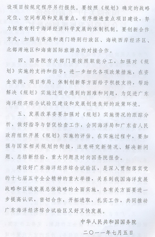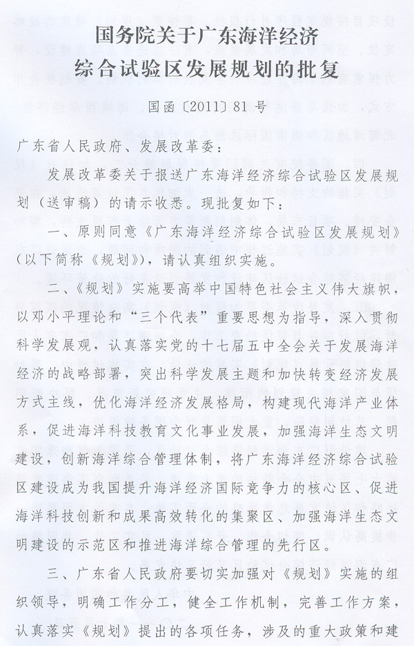 ? 轉(zhuǎn)發(fā)國(guó)務(wù)院關(guān)于廣東海洋經(jīng)濟(jì)綜合試驗(yàn)區(qū) 發(fā)展規(guī)劃的批復(fù)的通知 ? 各地級(jí)以上市人民政府,各縣(市、區(qū))人民政府,省政府各部門(mén)、各直屬機(jī)構(gòu): 現(xiàn)將《國(guó)務(wù)院關(guān)于廣東海洋經(jīng)濟(jì)綜合試驗(yàn)區(qū)發(fā)展規(guī)劃的批復(fù)》(國(guó)函〔2011〕81號(hào))轉(zhuǎn)發(fā)給你們,請(qǐng)遵照?qǐng)?zhí)行。 《廣東海洋經(jīng)濟(jì)綜合試驗(yàn)區(qū)發(fā)展規(guī)劃》(以下簡(jiǎn)稱(chēng)《規(guī)劃》)是繼《珠江三角洲地區(qū)改革發(fā)展規(guī)劃綱要(2008-2020年)》之后,推動(dòng)我省經(jīng)濟(jì)社會(huì)發(fā)展的又一國(guó)家層面的規(guī)劃,為我省探索海洋開(kāi)發(fā)新途徑和海洋綜合管理新模式,加快海洋經(jīng)濟(jì)發(fā)展,建設(shè)海洋經(jīng)濟(jì)強(qiáng)省,爭(zhēng)當(dāng)全國(guó)海洋事業(yè)發(fā)展排頭兵創(chuàng)造了新的重大機(jī)遇。各地、各有關(guān)部門(mén)要高度重視,把實(shí)施《規(guī)劃》作為“加快轉(zhuǎn)型升級(jí)、建設(shè)幸福廣東”的重要舉措,結(jié)合本地區(qū)、本部門(mén)實(shí)際,科學(xué)謀劃,精心部署,采取有效措施,推動(dòng)我省海洋經(jīng)濟(jì)加快發(fā)展。省發(fā)展改革委要會(huì)同省海洋漁業(yè)局加強(qiáng)對(duì)《規(guī)劃》實(shí)施工作的指導(dǎo)、監(jiān)督和檢查,抓緊制定實(shí)施《規(guī)劃》的政策措施,注重研究新情況、解決新問(wèn)題,加快建立完善有利于加快我省海洋綜合開(kāi)發(fā)的體制機(jī)制;要及時(shí)跟蹤分析實(shí)施情況,重大問(wèn)題及時(shí)向省政府報(bào)告。 ? ? ? ? 廣東省人民政府 二○一一年七月二十九日 ? ? ? ? ?