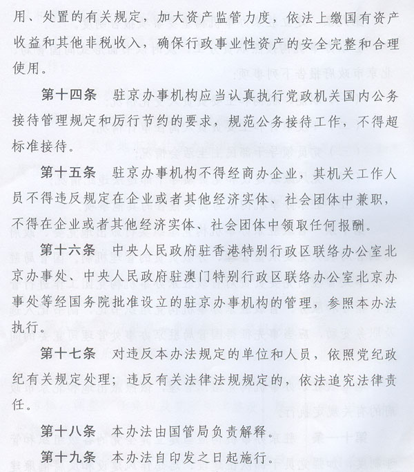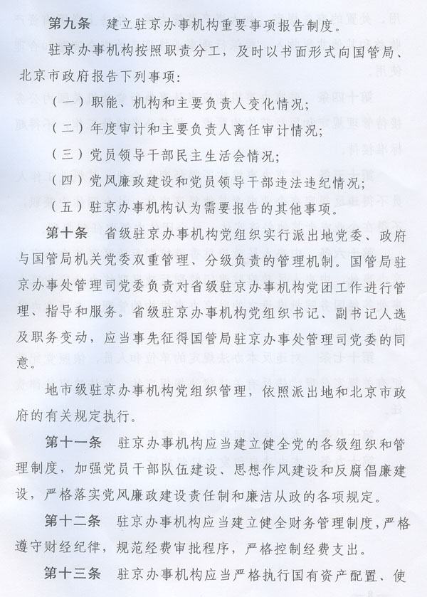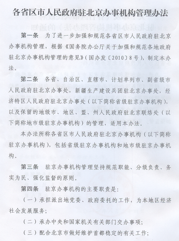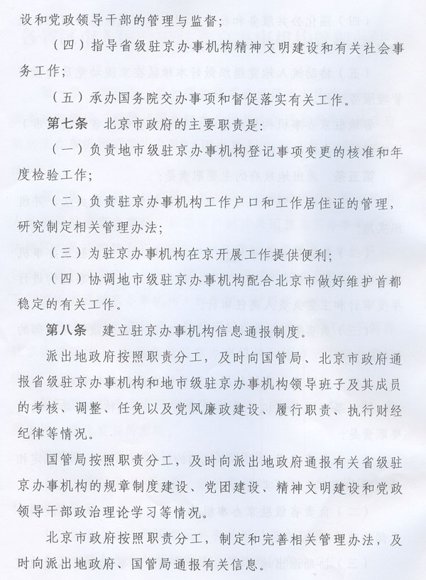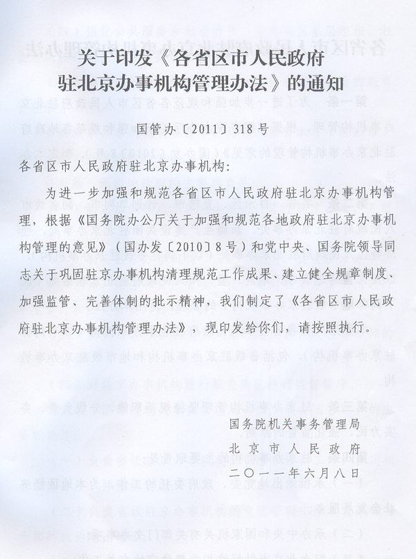? 轉發(fā)國務院機關事務管理局北京市人民政府 關于印發(fā)各省區(qū)市人民政府駐北京 辦事機構管理辦法的通知 ? 各地級以上市人民政府,順德區(qū)人民政府,省直有關單位: 經(jīng)省人民政府同意,現(xiàn)將國務院機關事務管理局、北京市人民政府《關于印發(fā)〈各省區(qū)市人民政府駐北京辦事機構管理辦法〉的通知》(國管辦〔2011〕318號,以下簡稱《管理辦法》)轉發(fā)給你們,結合我省實際提出如下意見,請一并貫徹執(zhí)行。 一、我省各駐京辦事機構要認真貫徹落實《管理辦法》的各項工作要求,切實做到規(guī)范職能、廉潔從政、務實為民,不斷強化公共服務和社會管理職能。要建立重要事項報告制度,健全黨的各級組織和管理制度,完善財務和資產(chǎn)管理制度,嚴格執(zhí)行黨政機關公務接待管理規(guī)定。要加強與國務院機關事務管理局、北京市人民政府的溝通協(xié)調,努力在推動地區(qū)間協(xié)作、服務本地區(qū)經(jīng)濟社會發(fā)展、處置突發(fā)事件、維護首都穩(wěn)定等方面發(fā)揮更加積極有效的作用。 二、設有駐京辦事機構的地級以上市人民政府和順德區(qū)人民政府,要切實履行監(jiān)督管理職責,按照《管理辦法》的要求,研究制訂并組織實施加強和規(guī)范本地區(qū)駐京辦事機構管理的制度辦法,制訂和落實駐京辦事機構“三定”方案,嚴格執(zhí)行黨風廉政建設責任制,加強駐京辦事機構人事、預算、財務和資產(chǎn)管理,按規(guī)定開展相關審計工作。要及時向國務院機關事務管理局、北京市人民政府和省政府駐京辦通報駐京辦事機構人事工作、履行職責、黨風廉政建設等方面的情況。省政府辦公廳將另行制訂加強和規(guī)范駐京辦事機構管理的制度辦法。 三、省駐京辦要切實加強對我省各駐京辦事機構的指導、協(xié)調、監(jiān)督,統(tǒng)籌全省在京資源,形成工作合力;要按照《關于同意成立中共廣東省駐北京機構委員會的批復》(粵組黨〔2010〕14號)的要求,抓緊推進中共廣東省駐北京機構委員會組建工作。各駐京辦事機構要加強與省駐京辦的溝通聯(lián)系,及時將處置突發(fā)事件、信訪維穩(wěn)及廉政建設等方面的情況報送省駐京辦,并積極配合省駐京辦做好相關工作。 ? ? ? ? 廣東省人民政府辦公廳 二○一一年八月二十四日 ? ? ? ?
