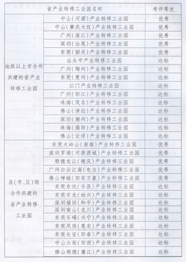 注:考評(píng)同等次的地級(jí)以上市排名不分先后。 (二)省產(chǎn)業(yè)轉(zhuǎn)移工業(yè)園考評(píng)結(jié)果。 全省34個(gè)省產(chǎn)業(yè)轉(zhuǎn)移工業(yè)園目標(biāo)責(zé)任考核均達(dá)標(biāo),具體情況如下: