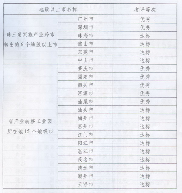 關(guān)于2010年度產(chǎn)業(yè)轉(zhuǎn)移目標(biāo) 責(zé)任考評(píng)情況的通報(bào) ? 各地級(jí)以上市人民政府,省政府各部門、各直屬機(jī)構(gòu): 為貫徹落實(shí)《中共廣東省委廣東省人民政府關(guān)于推進(jìn)產(chǎn)業(yè)轉(zhuǎn)移和勞動(dòng)力轉(zhuǎn)移的決定》(粵發(fā)〔2008〕4號(hào)),加快推進(jìn)我省產(chǎn)業(yè)轉(zhuǎn)移工作,按照省政府《印發(fā)廣東省產(chǎn)業(yè)轉(zhuǎn)移目標(biāo)責(zé)任考核評(píng)價(jià)辦法的通知》(粵府函〔2010〕132號(hào),以下簡(jiǎn)稱《考評(píng)辦法》)要求,省經(jīng)濟(jì)和信息化委會(huì)同省雙轉(zhuǎn)移工作領(lǐng)導(dǎo)小組成員單位,共同組織開展了2010年度產(chǎn)業(yè)轉(zhuǎn)移目標(biāo)責(zé)任考核評(píng)價(jià)工作。現(xiàn)將考評(píng)情況通報(bào)如下: 一、2010年度全省產(chǎn)業(yè)轉(zhuǎn)移工作取得顯著成效 ?。ㄒ唬┙?jīng)濟(jì)規(guī)模不斷發(fā)展壯大。截至2010年底,全省34個(gè)省產(chǎn)業(yè)轉(zhuǎn)移工業(yè)園入園項(xiàng)目(包括意向項(xiàng)目)達(dá)2423個(gè),總投資額達(dá)5447億元,其中已建成1196個(gè),投資額1181.6億元。全年實(shí)現(xiàn)產(chǎn)值1953.6億元、稅收108.85億元,同比分別增長(zhǎng)115.4%和105%。 (二)區(qū)域經(jīng)濟(jì)帶動(dòng)作用持續(xù)增強(qiáng)。2010年,省產(chǎn)業(yè)轉(zhuǎn)移工業(yè)園實(shí)現(xiàn)工業(yè)增加值479億元,同比增長(zhǎng)40.3%,占粵東西北地區(qū)工業(yè)增加值的13.5%。15個(gè)產(chǎn)業(yè)轉(zhuǎn)入地級(jí)市中,8個(gè)地級(jí)市園區(qū)工業(yè)增加值占全市比重超過10%,6個(gè)地級(jí)市比重達(dá)到或接近20%。 (三)引進(jìn)項(xiàng)目質(zhì)量顯著提高。2010年,省產(chǎn)業(yè)轉(zhuǎn)移工業(yè)園引進(jìn)投資額超過10億元的大型項(xiàng)目和項(xiàng)目組團(tuán)達(dá)42個(gè),比2009年增加20個(gè);入園單個(gè)項(xiàng)目平均投資額達(dá)2.25億元,比2009年提高21.6%。 (四)珠三角地區(qū)“騰籠換鳥”成效顯現(xiàn)。珠三角各市充分利用產(chǎn)業(yè)轉(zhuǎn)移騰出的發(fā)展空間,形成了各具特色的以產(chǎn)業(yè)轉(zhuǎn)移促進(jìn)轉(zhuǎn)型升級(jí)的模式,使現(xiàn)代服務(wù)業(yè)、高技術(shù)制造業(yè)、先進(jìn)制造業(yè)占地區(qū)生產(chǎn)總值的比重不斷上升。2010年,珠三角6個(gè)產(chǎn)業(yè)轉(zhuǎn)出市的先進(jìn)制造業(yè)產(chǎn)值占地區(qū)生產(chǎn)總值的比重比2009年提高2.2個(gè)百分點(diǎn),高技術(shù)制造業(yè)產(chǎn)值占地區(qū)生產(chǎn)總值的比重比2009年提高0.9個(gè)百分點(diǎn)(其中東莞市高出5.1個(gè)百分點(diǎn))。有關(guān)市人均生產(chǎn)總值的增速與地區(qū)生產(chǎn)總值的增速差距不斷縮小。 二、考評(píng)結(jié)果 ?。ㄒ唬└鞯丶?jí)以上市政府考評(píng)結(jié)果。 全省21個(gè)地級(jí)以上市2010年度產(chǎn)業(yè)轉(zhuǎn)移目標(biāo)責(zé)任考核全部達(dá)標(biāo),具體情況如下: