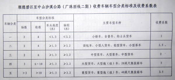 省交通運(yùn)輸廳、物價(jià)局: 粵交費(fèi)〔2010〕358號(hào)請(qǐng)示收悉。省人民政府同意順德碧江至中山沙溪公路(廣珠西線二期)交工驗(yàn)收通車(chē)和收費(fèi)站收費(fèi)設(shè)施經(jīng)驗(yàn)收符合省聯(lián)網(wǎng)收費(fèi)技術(shù)要求后開(kāi)始收費(fèi),收費(fèi)車(chē)型按全省高速公路統(tǒng)一標(biāo)準(zhǔn),即按車(chē)輛軸(輪)數(shù)及車(chē)頭高度等物理參數(shù)進(jìn)行分類,一至五類車(chē)收費(fèi)系數(shù)分別是1、1.5、2、3、3.5;收費(fèi)標(biāo)準(zhǔn)為0.6元/標(biāo)準(zhǔn)車(chē)公里。 ? 附件:1.順德碧江至中山沙溪公路(廣珠西線二期)收費(fèi)車(chē)輛車(chē)型分類標(biāo)準(zhǔn)及收費(fèi)系數(shù)表 2.順德碧江至中山沙溪公路(廣珠西線二期)車(chē)輛通行費(fèi)收費(fèi)標(biāo)準(zhǔn)表