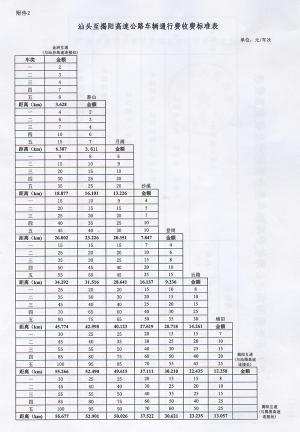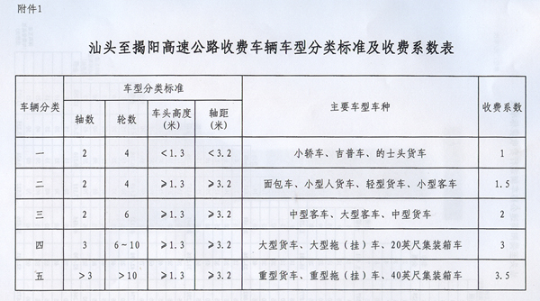 省交通運(yùn)輸廳、物價(jià)局: 粵交費(fèi)〔2011〕1351號請示收悉。省人民政府同意汕頭至揭陽高速公路外砂至庵埠段交工驗(yàn)收通車和收費(fèi)站收費(fèi)設(shè)施經(jīng)驗(yàn)收符合省聯(lián)網(wǎng)收費(fèi)技術(shù)要求后開始收費(fèi),汕頭至揭陽高速公路全線收費(fèi)車型按全省高速公路統(tǒng)一標(biāo)準(zhǔn),即按車輛軸(輪)數(shù)及車頭高度等物理參數(shù)進(jìn)行分類,一至五類車的收費(fèi)系數(shù)分別為1、15、2、3、35;月浦至揭東段收費(fèi)標(biāo)準(zhǔn)為0.45元/標(biāo)準(zhǔn)車公里,外砂至月浦段、揭東至新亨段收費(fèi)標(biāo)準(zhǔn)為0.6元/標(biāo)準(zhǔn)車公里。 ? 附件:1.汕頭至揭陽高速公路收費(fèi)車輛車型分類標(biāo)準(zhǔn)及收費(fèi)系數(shù)表 2.汕頭至揭陽高速公路車輛通行費(fèi)收費(fèi)標(biāo)準(zhǔn)表 ? 廣東省人民政府辦公廳 二○一一年十二月九日 ?