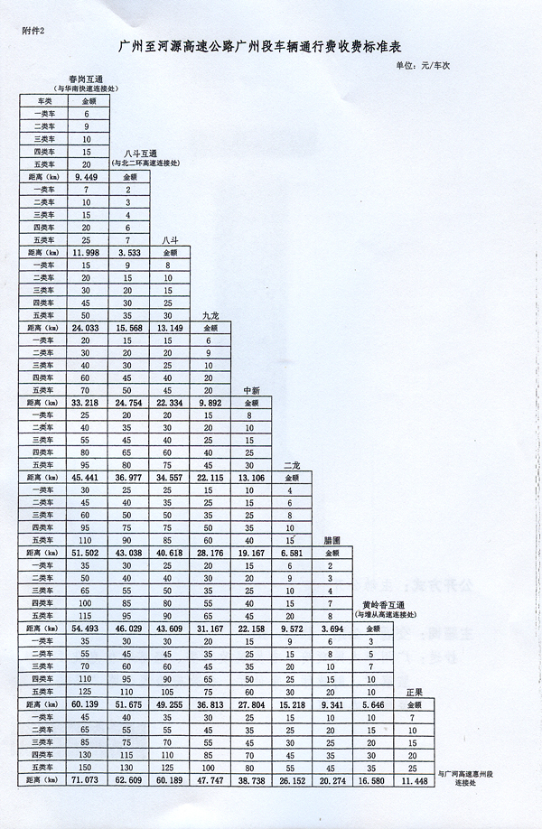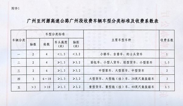 省交通運輸廳、物價局: 粵交費〔2011〕1123號請示收悉。省人民政府同意廣州至河源高速公路廣州段交工驗收通車和收費站收費設(shè)施經(jīng)驗收符合省聯(lián)網(wǎng)收費技術(shù)要求后開始收費,收費車型按全省高速公路統(tǒng)一標準,即按車輛軸(輪)數(shù)及車頭高度等物理參數(shù)進行分類,一至五類車的收費系數(shù)分別為1、15、2、3、35;收費標準為0.6元/標準車公里。 ? 附件:1.廣州至河源高速公路廣州段收費車輛車型分類標準及收費系數(shù)表 2.廣州至河源高速公路廣州段車輛通行費收費標準表 廣東省人民政府辦公廳 二○一一年十二月十三日