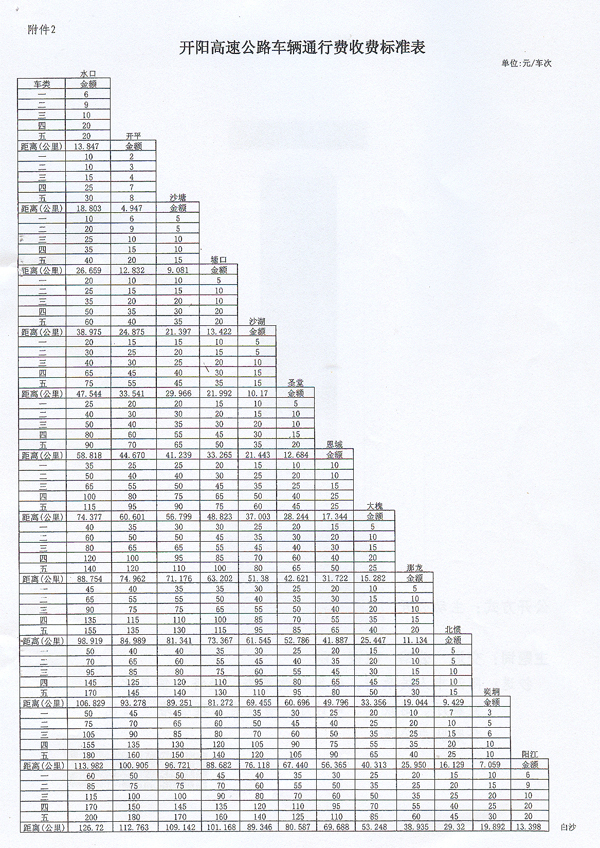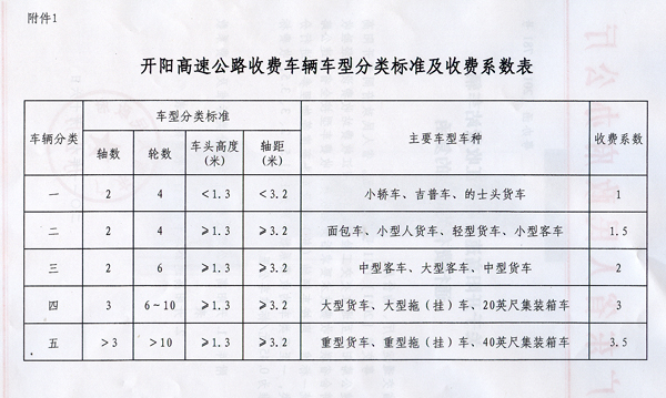 省交通運(yùn)輸廳、物價(jià)局: 粵交費(fèi)〔2011〕1511號(hào)請(qǐng)示收悉。省人民政府同意開(kāi)陽(yáng)高速公路陽(yáng)江互通立交交工驗(yàn)收通車(chē)和陽(yáng)江收費(fèi)站收費(fèi)設(shè)施經(jīng)驗(yàn)收符合省聯(lián)網(wǎng)收費(fèi)技術(shù)要求后開(kāi)始收費(fèi),收費(fèi)車(chē)型按全省高速公路統(tǒng)一標(biāo)準(zhǔn),即按車(chē)輛軸(輪)數(shù)及車(chē)頭高度等物理參數(shù)進(jìn)行分類(lèi),一至五類(lèi)車(chē)的收費(fèi)系數(shù)分別為1、15、2、3、35;收費(fèi)標(biāo)準(zhǔn)為0.45元/標(biāo)準(zhǔn)車(chē)公里。 ? 附件:1.開(kāi)陽(yáng)高速公路收費(fèi)車(chē)輛車(chē)型分類(lèi)標(biāo)準(zhǔn)及收費(fèi)系數(shù)表 2.開(kāi)陽(yáng)高速公路車(chē)輛通行費(fèi)收費(fèi)標(biāo)準(zhǔn)表