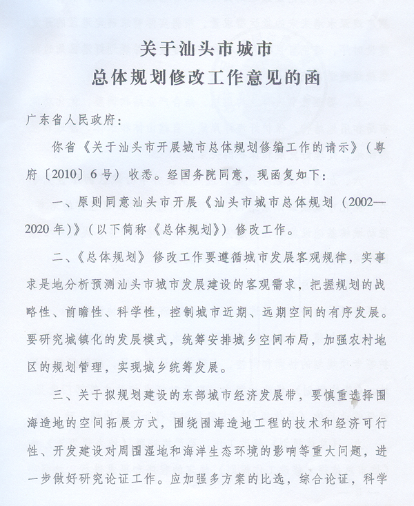 汕頭市人民政府,省住房城鄉(xiāng)建設(shè)廳: 現(xiàn)將住房和城鄉(xiāng)建設(shè)部《關(guān)于汕頭市城市總體規(guī)劃修改工作意見的函》(建規(guī)函〔2012〕42號(hào))轉(zhuǎn)發(fā)給你們,請(qǐng)遵照實(shí)施。 ? 廣東省人民政府 二○一二年四月九日