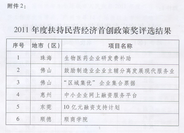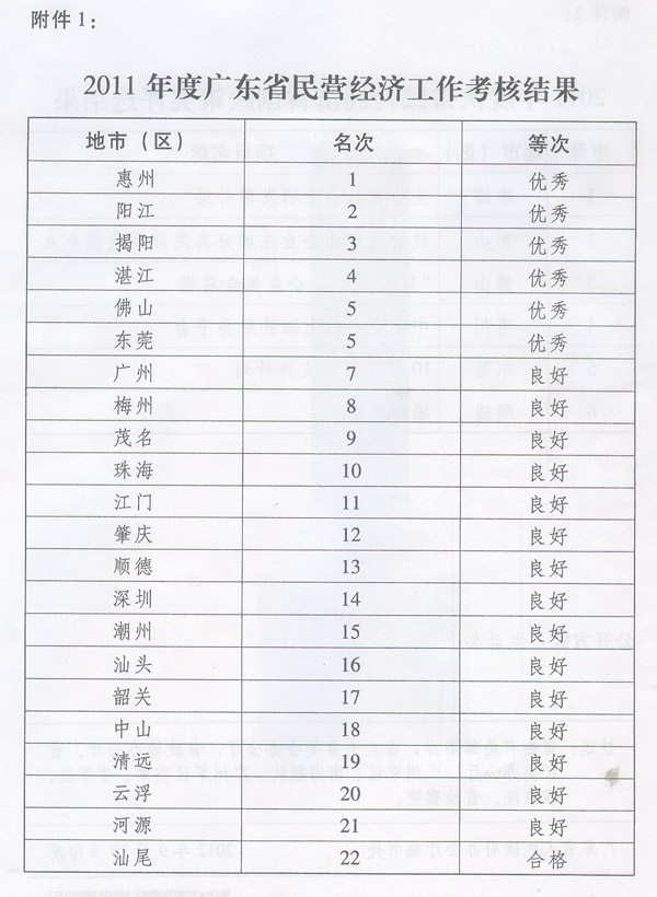 ? 廣東省人民政府辦公廳關(guān)于2011年度 廣東省民營經(jīng)濟(jì)工作考核及扶持民營經(jīng)濟(jì) 首創(chuàng)政策獎評選結(jié)果的通報 ? 各地級以上市人民政府,順德區(qū)人民政府,省政府各部門、各直屬機(jī)構(gòu): 按照《中共廣東省委廣東省人民政府關(guān)于促進(jìn)民營經(jīng)濟(jì)發(fā)展上水平的意見》(粵發(fā)〔2010〕16號)要求,省經(jīng)濟(jì)和信息化委會同省促進(jìn)民營經(jīng)濟(jì)發(fā)展聯(lián)席會議成員單位對各地級以上市和順德區(qū)人民政府2011年度民營經(jīng)濟(jì)工作進(jìn)行了考核,并對扶持民營經(jīng)濟(jì)首創(chuàng)政策獎進(jìn)行了評選,現(xiàn)就考核及評選結(jié)果通報如下:一、惠州市等6個地級市人民政府2011年度廣東省民營經(jīng)濟(jì)工作為優(yōu)秀等次,廣州市等14個地級以上市和順德區(qū)人民政府為良好等次,汕尾市人民政府為合格等次(見附件1)。 二、珠海市等4個地級市和順德區(qū)人民政府積極探索創(chuàng)新扶持民營經(jīng)濟(jì)政策,出臺的“生物醫(yī)藥企業(yè)研發(fā)費補(bǔ)助”等6項政策獲得2011年度扶持民營經(jīng)濟(jì)首創(chuàng)政策獎(見附件2)。 為鼓勵各地進(jìn)一步搞好民營經(jīng)濟(jì)的積極性和創(chuàng)造性,省人民政府決定對獲得2011年度廣東省民營經(jīng)濟(jì)工作考核優(yōu)秀等次及扶持民營經(jīng)濟(jì)首創(chuàng)政策獎的有關(guān)市、區(qū)人民政府予以通報表揚(yáng)。希望受表揚(yáng)的市、區(qū)再接再厲,不斷開拓創(chuàng)新,充分發(fā)揮示范作用,努力推動我省民營經(jīng)濟(jì)工作取得更大成績,為加快轉(zhuǎn)型升級、建設(shè)幸福廣東作出更大貢獻(xiàn)! ? 附件:1.2011年度廣東省民營經(jīng)濟(jì)工作考核結(jié)果 2.2011年度扶持民營經(jīng)濟(jì)首創(chuàng)政策獎評選結(jié)果 ? ? ? ? 廣東省人民政府辦公廳 2012年9月28日 ? ? ? ?