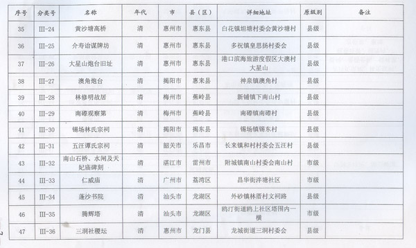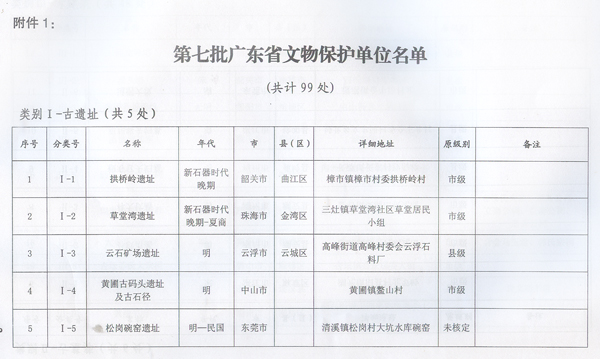 ? 廣東省人民政府關(guān)于公布第七批 廣東省文物保護(hù)單位的通知 ? 各地級以上市人民政府,各縣(市、區(qū))人民政府,省政府各部門、各直屬機(jī)構(gòu): 根據(jù)《中華人民共和國文物保護(hù)法》有關(guān)規(guī)定和第七批廣東省文物保護(hù)單位評估委員會評估意見,省人民政府同意省文化廳提出的第七批廣東省文物保護(hù)單位(共計(jì)99處),現(xiàn)予公布。 各地、各有關(guān)單位要認(rèn)真貫徹“保護(hù)為主、搶救第一、合理利用、加強(qiáng)管理”的方針,切實(shí)做好文物的保護(hù)、利用和管理工作。 ? 附件:第七批廣東省文物保護(hù)單位名單 ? ? ? ? 廣東省人民政府 2012年10月20日 ? ? ?