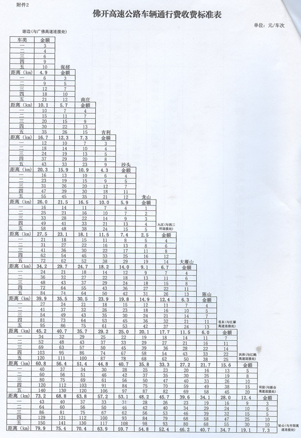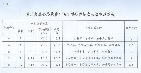 ? 廣東省人民政府辦公廳關(guān)于佛開高速公路 車輛通行費(fèi)有關(guān)問(wèn)題的復(fù)函 ? 省交通運(yùn)輸廳、物價(jià)局: 粵交費(fèi)〔2012〕1220號(hào)請(qǐng)示收悉。省人民政府同意佛開高速公路謝邊至三堡段改擴(kuò)建工程交工驗(yàn)收通車和收費(fèi)站收費(fèi)設(shè)施經(jīng)驗(yàn)收符合省聯(lián)網(wǎng)收費(fèi)技術(shù)要求后,佛開高速公路按全省高速公路統(tǒng)一標(biāo)準(zhǔn)進(jìn)行收費(fèi)。收費(fèi)車型按車輛軸(輪)數(shù)及車頭高度等物理參數(shù)進(jìn)行分類,一至五類車的收費(fèi)系數(shù)分別為1、1.5、2、3、3.5;三堡至開平段收費(fèi)標(biāo)準(zhǔn)為0.45元/標(biāo)準(zhǔn)車公里,謝邊至三堡段收費(fèi)標(biāo)準(zhǔn)為0.6元/標(biāo)準(zhǔn)車公里。 ? 附件:1.佛開高速公路收費(fèi)車輛車型分類標(biāo)準(zhǔn)及收費(fèi)系數(shù)表 2.佛開高速公路車輛通行費(fèi)收費(fèi)標(biāo)準(zhǔn)表 ? ? ? 省府辦公廳 2012年12月18日 ? ? ?