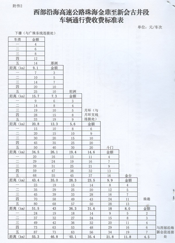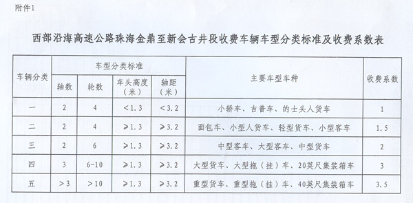 ? 廣東省人民政府辦公廳關(guān)于西部沿海高速公路 珠海金鼎至新會古井段金臺收費(fèi)站車輛 通行費(fèi)有關(guān)問題的復(fù)函 ? 省交通運(yùn)輸廳、物價局: 粵交費(fèi)〔2012〕1426號請示收悉。省人民政府同意西部沿海高速公路珠海金鼎至新會古井段金臺互通立交交工驗(yàn)收通車和金臺收費(fèi)站收費(fèi)設(shè)施經(jīng)驗(yàn)收符合省聯(lián)網(wǎng)收費(fèi)技術(shù)要求后開始收費(fèi),收費(fèi)車型按全省高速公路統(tǒng)一標(biāo)準(zhǔn),即按車輛軸(輪)數(shù)及車頭高度等物理參數(shù)進(jìn)行分類,一至五類車的收費(fèi)系數(shù)分別為1、1.5、2、3、3.5;收費(fèi)標(biāo)準(zhǔn)按雙向4車道0.45元/標(biāo)準(zhǔn)車公里執(zhí)行。 ? 附件:1.西部沿海高速公路珠海金鼎至新會古井段收費(fèi)車輛車型分類標(biāo)準(zhǔn)及收費(fèi)系數(shù)表 2.西部沿海高速公路珠海金鼎至新會古井段車輛通行費(fèi)收費(fèi)標(biāo)準(zhǔn)表 ? ? ? ? 省府辦公廳 2012年12月20日 ? ? ? ?