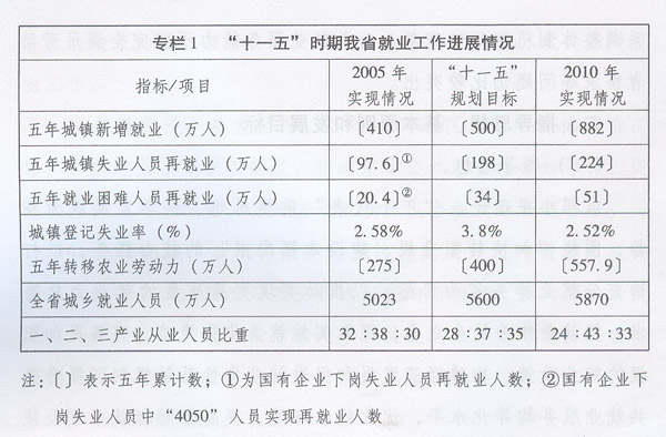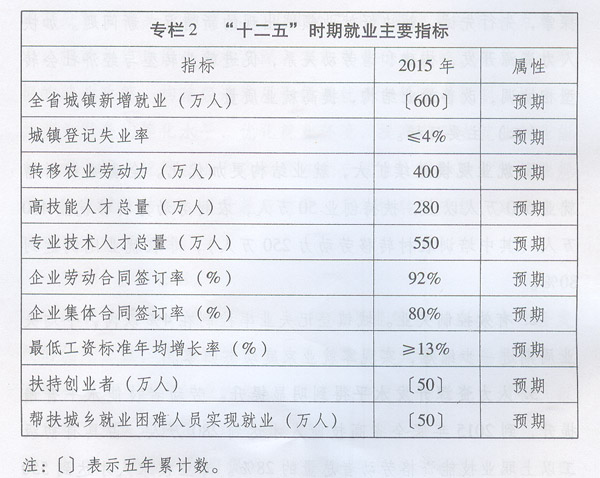 ? (二)“十二五”時(shí)期面臨的就業(yè)形勢(shì)。 “十二五”時(shí)期,我省就業(yè)形勢(shì)將更加復(fù)雜,就業(yè)任務(wù)更加繁重。一是勞動(dòng)力供大于求的總量壓力仍然存在?!笆濉睍r(shí)期,我省仍處在勞動(dòng)年齡人口增長(zhǎng)高峰期,城市化過程中還有相當(dāng)數(shù)量的農(nóng)業(yè)富余勞動(dòng)力需要轉(zhuǎn)移就業(yè),每年需就業(yè)的勞動(dòng)力達(dá)到280萬人以上。二是就業(yè)的結(jié)構(gòu)性矛盾更加突出。我省產(chǎn)業(yè)轉(zhuǎn)型升級(jí)步伐加快,企業(yè)對(duì)技能人才的需求更加迫切,部分企業(yè)招工難與部分勞動(dòng)者就業(yè)難并存的現(xiàn)象仍將存在,以高校畢業(yè)生為重點(diǎn)的青年就業(yè)、農(nóng)業(yè)富余勞動(dòng)力轉(zhuǎn)移就業(yè)、失業(yè)人員再就業(yè)以及就業(yè)困難群體實(shí)現(xiàn)就業(yè)難度依然較大。三是社會(huì)環(huán)境變化對(duì)促進(jìn)就業(yè)提出了新的挑戰(zhàn)。社會(huì)轉(zhuǎn)型中勞動(dòng)關(guān)系矛盾凸顯,勞動(dòng)者利益訴求發(fā)生新的變化,穩(wěn)定就業(yè)難度加大。與此同時(shí),勞動(dòng)關(guān)系調(diào)整體制機(jī)制不夠完善、公共就業(yè)服務(wù)能力不能完全滿足勞動(dòng)者需求等問題仍比較突出。 二、指導(dǎo)思想、基本原則和發(fā)展目標(biāo) (一)指導(dǎo)思想。 以鄧小平理論、“三個(gè)代表”重要思想、科學(xué)發(fā)展觀為指導(dǎo),圍繞“加快轉(zhuǎn)型升級(jí)、建設(shè)幸福廣東”的核心任務(wù),以打造充分就業(yè)排頭省為目標(biāo),以推動(dòng)實(shí)現(xiàn)更高質(zhì)量的就業(yè)為總要求,把就業(yè)作為民生之本,深入實(shí)施就業(yè)優(yōu)先戰(zhàn)略,完善更加積極的就業(yè)政策,構(gòu)建經(jīng)濟(jì)發(fā)展和促進(jìn)就業(yè)良性互動(dòng)機(jī)制,提升公共就業(yè)服務(wù)均等化水平,優(yōu)化就業(yè)環(huán)境,提高勞動(dòng)者就業(yè)創(chuàng)業(yè)能力,推進(jìn)城鄉(xiāng)統(tǒng)籌就業(yè)和各類群體充分就業(yè),進(jìn)一步擴(kuò)大就業(yè)規(guī)模、優(yōu)化就業(yè)結(jié)構(gòu)、提升就業(yè)質(zhì)量,為加快轉(zhuǎn)型升級(jí)、建設(shè)幸福廣東作出積極貢獻(xiàn)。 (二)基本原則。 1.民生為本,就業(yè)優(yōu)先。堅(jiān)持將促進(jìn)就業(yè)放在經(jīng)濟(jì)社會(huì)發(fā)展的優(yōu)先位置,作為保障和改善民生的頭等大事,處理好轉(zhuǎn)變經(jīng)濟(jì)增長(zhǎng)方式與促進(jìn)就業(yè)的關(guān)系,依靠經(jīng)濟(jì)發(fā)展帶動(dòng)就業(yè)增長(zhǎng),以擴(kuò)大就業(yè)來促進(jìn)經(jīng)濟(jì)持續(xù)發(fā)展。 2.市場(chǎng)調(diào)節(jié),政府促進(jìn)。充分發(fā)揮市場(chǎng)機(jī)制在人力資源配置中的基礎(chǔ)性作用,消除制度性、體制性障礙,健全勞動(dòng)者自主擇業(yè)、市場(chǎng)調(diào)節(jié)就業(yè)、政府促進(jìn)就業(yè)相結(jié)合的機(jī)制。進(jìn)一步強(qiáng)化政府在促進(jìn)就業(yè)中的責(zé)任,將促進(jìn)就業(yè)作為制訂、實(shí)施和調(diào)整經(jīng)濟(jì)社會(huì)政策的基本目標(biāo),廣泛動(dòng)員社會(huì)各方面力量,共同做好就業(yè)工作。 3.統(tǒng)籌推進(jìn),注重公平。統(tǒng)籌不同地區(qū)、不同群體就業(yè)工作,加快建立平等就業(yè)制度,推進(jìn)基本公共就業(yè)服務(wù)均等化,促進(jìn)公共資源均衡配置,保障勞動(dòng)者就業(yè)機(jī)會(huì)和就業(yè)環(huán)境公平。 4.先行先試,加快轉(zhuǎn)型。適應(yīng)轉(zhuǎn)變發(fā)展方式的需要,積極探索,先行先試,解決好就業(yè)領(lǐng)域出現(xiàn)的新情況、新問題。加快人力資源開發(fā),構(gòu)建和諧勞動(dòng)關(guān)系,促進(jìn)就業(yè)轉(zhuǎn)型與經(jīng)濟(jì)社會(huì)轉(zhuǎn)型相協(xié)調(diào),改善就業(yè)結(jié)構(gòu),提高就業(yè)質(zhì)量。 (三)主要目標(biāo)。 1.就業(yè)規(guī)模繼續(xù)擴(kuò)大,就業(yè)結(jié)構(gòu)更加優(yōu)化。全省城鎮(zhèn)新增就業(yè)600萬人以上,扶持創(chuàng)業(yè)50萬人,農(nóng)村勞動(dòng)力轉(zhuǎn)移就業(yè)400萬人(其中培訓(xùn)農(nóng)村轉(zhuǎn)移勞動(dòng)力250萬人),非農(nóng)就業(yè)比例達(dá)到80%。 2.有效控制失業(yè)。城鎮(zhèn)登記失業(yè)率控制在4%以內(nèi),平均失業(yè)周期進(jìn)一步縮短,實(shí)現(xiàn)零就業(yè)家庭動(dòng)態(tài)歸零。 3.人力資源開發(fā)水平得到明顯提升。勞動(dòng)者技能水平普遍提升,到2015年底全省高技能人才達(dá)到280萬人,占具有初級(jí)工以上職業(yè)技能資格勞動(dòng)者總量的28%。專業(yè)技術(shù)人才達(dá)到550萬人。 4.統(tǒng)一、規(guī)范、靈活的人力資源市場(chǎng)基本形成。人力資源市場(chǎng)管理制度逐步統(tǒng)一。公共就業(yè)和人才服務(wù)體系進(jìn)一步健全,實(shí)現(xiàn)勞動(dòng)就業(yè)服務(wù)平臺(tái)全覆蓋街道(鄉(xiāng)鎮(zhèn))和社區(qū)(村),公共就業(yè)和人才服務(wù)信息網(wǎng)絡(luò)實(shí)現(xiàn)全省互聯(lián)互通。 5.就業(yè)質(zhì)量穩(wěn)步提高。企業(yè)勞動(dòng)合同簽訂率達(dá)到92%,集體合同簽訂率達(dá)到80%。職工工資收入水平合理較快增長(zhǎng),最低工資標(biāo)準(zhǔn)年均增長(zh