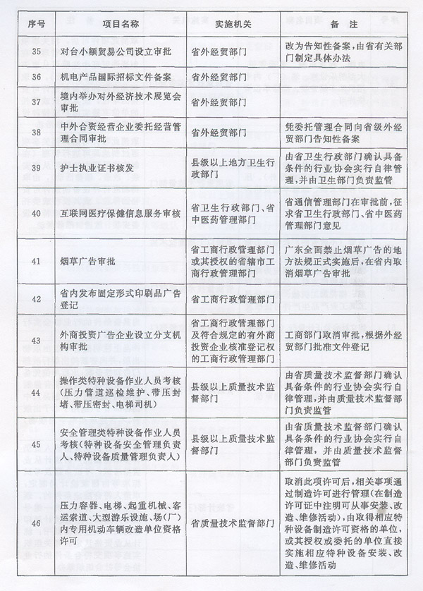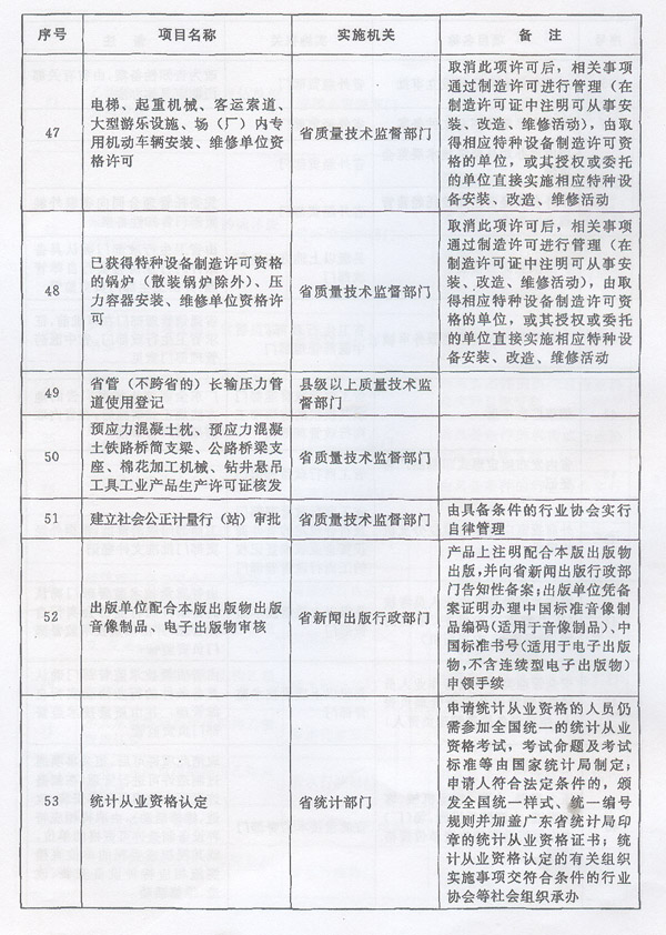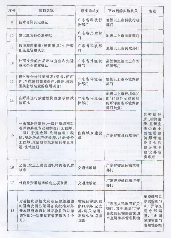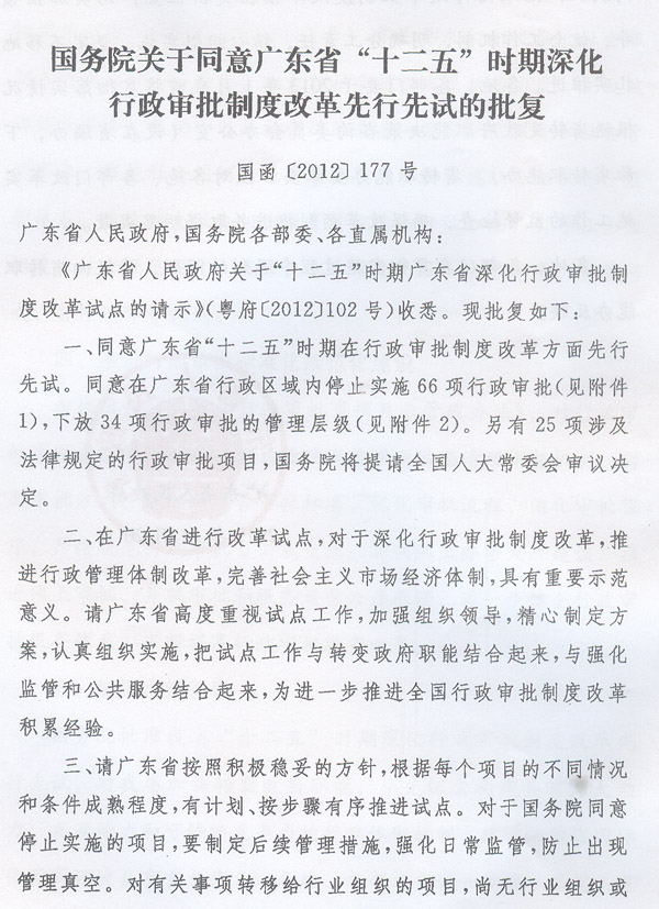 ? 廣東省人民政府轉(zhuǎn)發(fā)《國(guó)務(wù)院關(guān)于同意 廣東省“十二五”時(shí)期深化行政審批 制度改革先行先試的批復(fù)》的通知 ? 各地級(jí)以上市人民政府,各縣(市、區(qū))人民政府,省政府各部門(mén)、各直屬機(jī)構(gòu): 現(xiàn)將《國(guó)務(wù)院關(guān)于同意廣東省“十二五”時(shí)期深化行政審批制度改革先行先試的批復(fù)》(國(guó)函〔2012〕177號(hào))轉(zhuǎn)給你們,并結(jié)合我省實(shí)際提出以下意見(jiàn),請(qǐng)一并認(rèn)真貫徹執(zhí)行。 一、積極穩(wěn)妥做好實(shí)施工作 各地、各部門(mén)要結(jié)合當(dāng)前正在推進(jìn)的各級(jí)行政審批制度改革工作,抓緊制訂具體實(shí)施方案,明確實(shí)施時(shí)間、任務(wù)和進(jìn)度安排等,確保行政審批項(xiàng)目取消和調(diào)整工作及時(shí)落實(shí)到位。 ?。ㄒ唬╆P(guān)于國(guó)務(wù)院同意在我省行政區(qū)域內(nèi)停止實(shí)施的行政審批事項(xiàng)。 對(duì)國(guó)務(wù)院同意在我省行政區(qū)域內(nèi)停止實(shí)施的行政審批事項(xiàng),原實(shí)施機(jī)關(guān)自本通知下發(fā)之日起停止實(shí)施,不得變相審批。 對(duì)國(guó)務(wù)院同意在我省行政區(qū)域內(nèi)政府部門(mén)不再實(shí)施、轉(zhuǎn)移給具備條件的行業(yè)組織實(shí)行自律管理的事項(xiàng),要根據(jù)國(guó)函〔2012〕177號(hào)文規(guī)定的具體內(nèi)容,結(jié)合省編委《政府向社會(huì)轉(zhuǎn)移職能工作方案》(粵機(jī)編〔2012〕22號(hào))有關(guān)要求,分類分步轉(zhuǎn)移,積極穩(wěn)妥有序推進(jìn),確保相關(guān)事項(xiàng)“轉(zhuǎn)得出、接得穩(wěn)”。已經(jīng)具備條件的事項(xiàng),要立即實(shí)施轉(zhuǎn)移;基本具備條件的事項(xiàng),要制訂分步驟分階段工作安排,逐步實(shí)施轉(zhuǎn)移;暫不具備條件的事項(xiàng),要加快培育行業(yè)組織,設(shè)定一定過(guò)渡期并明確過(guò)渡期內(nèi)的管理安排。各部門(mén)要就每項(xiàng)轉(zhuǎn)移事項(xiàng)制訂實(shí)施方案,報(bào)本級(jí)機(jī)構(gòu)編制部門(mén)或行政審批制度改革牽頭部門(mén)審定。除需新成立行業(yè)組織后再實(shí)施轉(zhuǎn)移的事項(xiàng)外,其他轉(zhuǎn)移事項(xiàng)的交接工作爭(zhēng)取在2013年上半年基本完成。 ?。ǘ╆P(guān)于國(guó)務(wù)院同意下放管理層級(jí)的行政審批事項(xiàng)。 由國(guó)家部門(mén)下放到我省實(shí)施的行政審批事項(xiàng),各地、各部門(mén)要積極主動(dòng)與國(guó)家有關(guān)部門(mén)做好溝通銜接,爭(zhēng)取在2012年年底前完成交接工作,并在國(guó)家相關(guān)部門(mén)的指導(dǎo)下,依法開(kāi)展行政審批。 對(duì)國(guó)務(wù)院同意我省下放到市、縣實(shí)施的行政審批事項(xiàng),原實(shí)施機(jī)關(guān)要在2012年年底前與承接單位完成交接工作,并通過(guò)有效方式向社會(huì)公布交接日期、下放事項(xiàng)及權(quán)責(zé)關(guān)系等。在交接期間,原實(shí)施機(jī)關(guān)要繼續(xù)做好相關(guān)管理工作,防止交接過(guò)程中出現(xiàn)管理“真空”。原實(shí)施機(jī)關(guān)要加強(qiáng)對(duì)承接單位的業(yè)務(wù)培訓(xùn)和指導(dǎo),促進(jìn)承接單位依法依規(guī)有序開(kāi)展工作。行政審批事項(xiàng)下放后,實(shí)施機(jī)關(guān)為市、縣(市、區(qū))人民政府的,由市、縣(市、區(qū))人民政府確定具體實(shí)施部門(mén)。除另有規(guī)定外,佛山市順德區(qū)政府(部門(mén))享有下放給地級(jí)以上市政府(部門(mén))的權(quán)限。 二、切實(shí)加強(qiáng)監(jiān)管 在取消、調(diào)整行政審批事項(xiàng)的同時(shí),要努力改變重審批、輕監(jiān)管的管理方式,加快推動(dòng)政府部門(mén)工作重心向制訂標(biāo)準(zhǔn)規(guī)則和強(qiáng)化監(jiān)管轉(zhuǎn)移,管理方式由事前審批向事中、事后監(jiān)管轉(zhuǎn)變。各部門(mén)要根據(jù)省編委《關(guān)于加強(qiáng)對(duì)行政審批制度改革調(diào)整事項(xiàng)監(jiān)管的意見(jiàn)》(粵機(jī)編〔2012〕23號(hào))有關(guān)要求,結(jié)合社會(huì)信用體系建設(shè)和市場(chǎng)監(jiān)管體系建設(shè),針對(duì)取消、調(diào)整的行政審批事項(xiàng),逐項(xiàng)制訂具體監(jiān)管辦法,切實(shí)履行好后續(xù)監(jiān)管職責(zé),抓緊完善各領(lǐng)域、各環(huán)節(jié)的監(jiān)管制度和管理規(guī)范,強(qiáng)化監(jiān)管責(zé)任,落實(shí)監(jiān)管措施,防止監(jiān)管缺位。 三、加快培育發(fā)展和規(guī)范社會(huì)組織 按照省委、省政府《關(guān)于進(jìn)一步培育發(fā)展和規(guī)范管理社會(huì)組織的方案》(粵發(fā)〔2012〕7號(hào))有關(guān)要求,積極推進(jìn)社會(huì)組織去行政化和去壟斷化,加大對(duì)社會(huì)組織發(fā)展扶持力度,擴(kuò)大政府購(gòu)買(mǎi)服務(wù),鼓勵(lì)和引導(dǎo)社會(huì)組織更多地參與社會(huì)服務(wù)和社會(huì)管理事務(wù),促進(jìn)社會(huì)組織良性有序發(fā)展。加快構(gòu)建社會(huì)組織綜合監(jiān)管體系,建立健全社會(huì)組織服務(wù)管理能力評(píng)估辦法,引導(dǎo)社會(huì)組織建立健全規(guī)范運(yùn)作、誠(chéng)信執(zhí)業(yè)、信息公開(kāi)、公平競(jìng)爭(zhēng)、