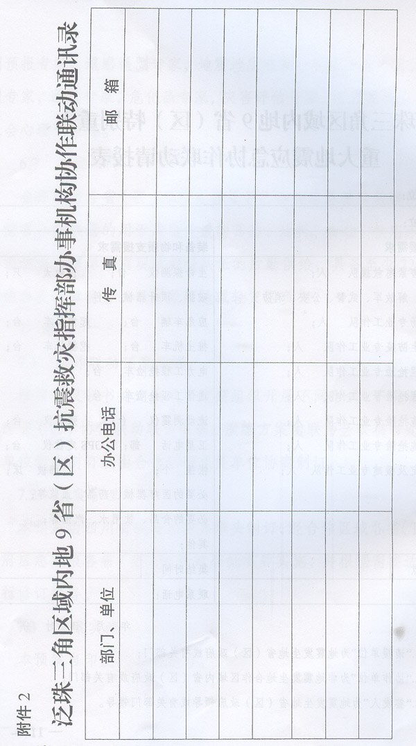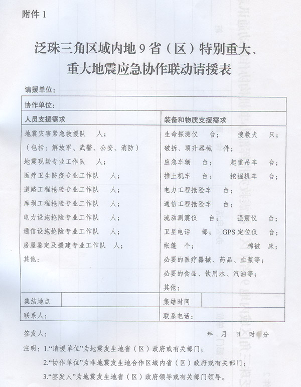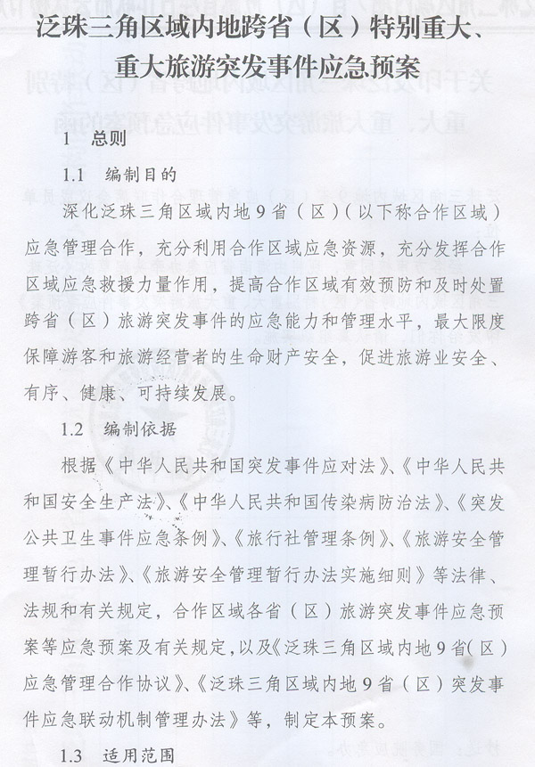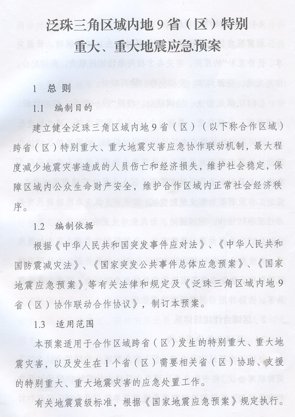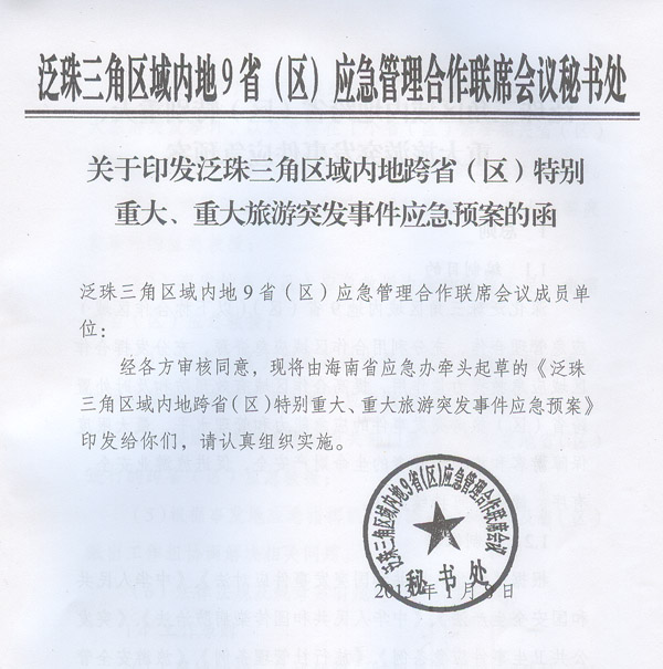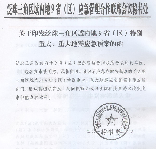 ? 廣東省人民政府辦公廳關(guān)于轉(zhuǎn)發(fā)《泛珠三角區(qū)域 內(nèi)地9?。▍^(qū))特別重大、重大地震應(yīng)急預(yù)案》、 《泛珠三角區(qū)域內(nèi)地跨?。▍^(qū))特別重大、 重大旅游突發(fā)事件應(yīng)急預(yù)案》的通知 ? 韶關(guān)、河源、梅州、湛江、茂名、肇慶、清遠(yuǎn)、潮州、云浮市人民政府,省應(yīng)急委成員單位: 根據(jù)省府領(lǐng)導(dǎo)同志意見(jiàn),現(xiàn)將泛珠三角區(qū)域內(nèi)地9?。▍^(qū))應(yīng)急管理合作聯(lián)席會(huì)議秘書(shū)處《關(guān)于印發(fā)泛珠三角區(qū)域內(nèi)地9?。▍^(qū))特別重大、重大地震應(yīng)急預(yù)案的函》、《關(guān)于印發(fā)泛珠三角區(qū)域內(nèi)地跨?。▍^(qū))特別重大、重大旅游突發(fā)事件應(yīng)急預(yù)案的函》轉(zhuǎn)發(fā)給你們,請(qǐng)結(jié)合《廣東省突發(fā)事件應(yīng)對(duì)條例》有關(guān)規(guī)定,認(rèn)真貫徹落實(shí)。執(zhí)行中遇到的問(wèn)題,請(qǐng)徑與省政府應(yīng)急辦聯(lián)系。 ? 省府辦公廳 2013年1月10日 ? ?