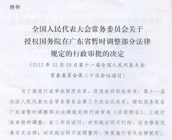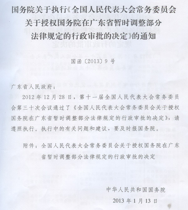 現(xiàn)將《國(guó)務(wù)院關(guān)于執(zhí)行〈全國(guó)人民代表大會(huì)常務(wù)委員會(huì)關(guān)于授權(quán)國(guó)務(wù)院在廣東省暫時(shí)調(diào)整部分法律規(guī)定的行政審批的決定〉的通知》(國(guó)函〔2013〕9號(hào))轉(zhuǎn)發(fā)給你們,請(qǐng)認(rèn)真貫徹執(zhí)行。