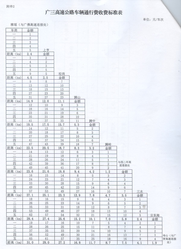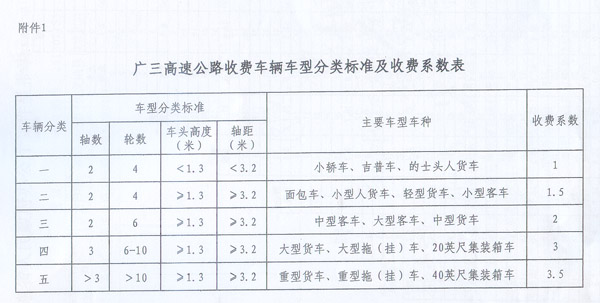 粵交費〔2013〕155、224號請示收悉。省人民政府同意廣三高速公路改擴建工程設(shè)立云東海匝道收費站。該擴建工程交工驗收通車和收費站收費設(shè)施經(jīng)驗收符合省聯(lián)網(wǎng)收費技術(shù)要求后,廣三高速公路按全省高速公路統(tǒng)一標準進行收費,即收費車型按車輛軸(輪)數(shù)及車頭高度等物理參數(shù)進行分類,一至五類車的收費系數(shù)分別為1、1.5、2、3、3.5;收費標準為0.6元/標準車公里。 2.廣三高速公路車輛通行費收費標準表 ? ? 省府辦公廳 2013年3月14日 ?