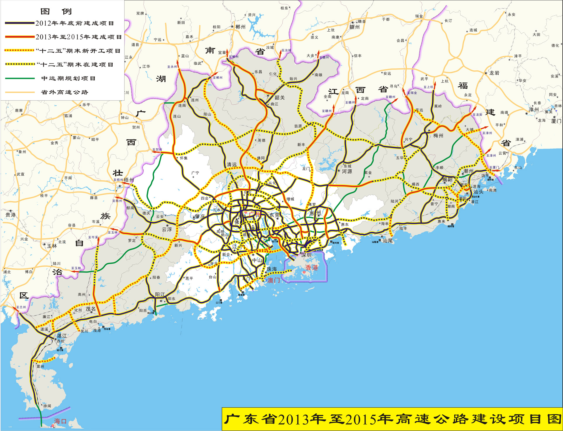 除2013年至2017年安排建設69個項目外,中遠期還將建設興寧至汕尾高速公路五華至陸河段、中山市東部外環(huán)高速公路、惠陽(沙田)至東莞(清溪)高速公路、懷集至陽江港高速公路懷集至郁南段、陽江海陵島大橋、河(源)惠(州)東(莞)高速公路、大(埔)豐(順)五(華)高速公路、羅定至信宜(粵桂界)高速公路等項目。上述項目建成后,我省將形成以珠江三角洲為核心,以沿海為扇面,以主要城市(港口)為龍頭向山區(qū)和內(nèi)陸省區(qū)輻射的高速公路網(wǎng)布局,高速公路總里程將達到11570公里。