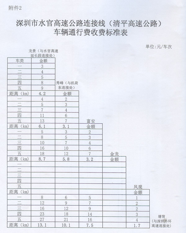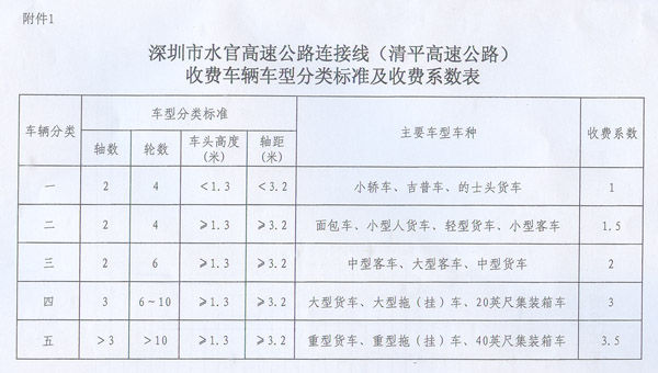 ? 廣東省人民政府辦公廳關(guān)于深圳水官高速 公路連接線(清平高速公路)車(chē)輛 通行費(fèi)有關(guān)問(wèn)題的復(fù)函 省交通運(yùn)輸廳、物價(jià)局: 粵交費(fèi)〔2013〕597號(hào)請(qǐng)示收悉。省人民政府同意深圳水官高速公路連接線(清平高速公路)交工驗(yàn)收通車(chē)和收費(fèi)站收費(fèi)設(shè)施經(jīng)驗(yàn)收符合省聯(lián)網(wǎng)收費(fèi)技術(shù)要求后開(kāi)始收費(fèi),收費(fèi)車(chē)型按全省高速公路統(tǒng)一標(biāo)準(zhǔn),即按車(chē)輛軸(輪)數(shù)及車(chē)頭高度等物理參數(shù)進(jìn)行分類(lèi),一至五類(lèi)車(chē)的收費(fèi)系數(shù)分別為1、1.5、2、3、3.5;收費(fèi)標(biāo)準(zhǔn)按0.6元/標(biāo)準(zhǔn)車(chē)公里執(zhí)行。