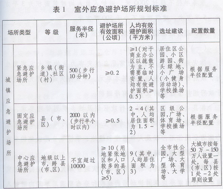 2.室內(nèi)應(yīng)急避護場所規(guī)劃標準。 服務(wù)半徑不超過2000米,避護人員人均建筑面積為3平方米-5平方米,建筑面積不小于500平方米。 四、室外應(yīng)急避護場所規(guī)劃建設(shè)要求 (一)建立防災(zāi)避護單元。 防災(zāi)避護單元,可作為常見自然災(zāi)害為主的重大災(zāi)害發(fā)生時,政府和居民防災(zāi)避護的基本單元。設(shè)置防災(zāi)避護單元,有利于政府組織管理和居民安全有序避護。 各縣(市、區(qū))要結(jié)合行政區(qū)劃及城鄉(xiāng)規(guī)劃管理要求,以鄉(xiāng)鎮(zhèn)(街道)為基礎(chǔ),充分考慮主要山體、河流、鐵路、高速公路的分隔作用,以及人口密度和綠地、學校等公共設(shè)施的分布建立固定應(yīng)急避護場所防災(zāi)避護單元。 室外固定應(yīng)急避護場所可結(jié)合防災(zāi)避護單元統(tǒng)一安排,防災(zāi)避護單元內(nèi)室外應(yīng)急避護場所的規(guī)模和分布要滿足單元內(nèi)避護人員的避護需求。未納入防災(zāi)避護單元的部分偏遠、零散居民點可由鄰近單元提供應(yīng)急避護。 (二)選址要求。 室外應(yīng)急避護場所的建設(shè)選址需要符合以下要求: 1.安全性。選址要避開地震斷裂帶和可能發(fā)生地質(zhì)災(zāi)害的地區(qū),遠離水庫泄洪區(qū)、低洼地易積水地區(qū),以及高壓走廊、次高壓以上燃氣管道、成品油輸送管道、大型油氣及其他危險倉儲區(qū)、大型化工園區(qū)等危險設(shè)施的影響范圍,高層建筑物、高聳構(gòu)筑物的垮塌范圍。室外應(yīng)急避護場所距次生災(zāi)害危險源的距離,要滿足國家現(xiàn)行重大危險源和防火有關(guān)標準規(guī)范要求。四周有次生火災(zāi)或爆炸危險源時,要設(shè)置防火隔離帶或防火樹林帶。場所與周圍易燃建筑等一般地震次生災(zāi)源之間要設(shè)置不小于30米的防火安全帶;與易燃易爆工廠倉庫、供氣廠、儲氣站等重大次生火災(zāi)或爆炸危險源距離不小于1000米。應(yīng)急避護場所不得設(shè)在可能發(fā)生非煤礦山尾礦庫潰壩事故波及的范圍內(nèi)。 2.便捷性。室外應(yīng)急避護場所的設(shè)置要考慮人口密度分布、按照服務(wù)半徑要求進行均衡布局,優(yōu)先考慮公園、廣場、體育場等現(xiàn)有公共設(shè)施資源。要選址于周邊道路條件較好的用地,便于受災(zāi)群眾的快速疏散轉(zhuǎn)移。緊急應(yīng)急避護場所要保證步行可快速到達;固定應(yīng)急避護場所要保證車行和步行均可便捷到達;中心應(yīng)急避護場所和區(qū)域性應(yīng)急避護場所除保證車行和步行可達性外,要確保與城市陸、海、空交通系統(tǒng)有便捷交通聯(lián)系。 3.合法性。縣級以上文物保護單位的公園等場所作為應(yīng)急避護場所時,要劃定避護區(qū)域,有關(guān)避護設(shè)施建設(shè)不得破壞文物及其環(huán)境。相關(guān)設(shè)施要盡量在文物保護單位的建設(shè)控制地帶之外。如因條件所限制需要設(shè)于建筑控制地帶之內(nèi)的,要依照文物保護的相關(guān)法律法規(guī)按程序報批。 (三)規(guī)劃要求。 1.緊急應(yīng)急避護場所規(guī)劃要求。 ?。?)緊急應(yīng)急避護場所要按照場所服務(wù)范圍內(nèi)的晝夜最大人口峰值進行設(shè)置。 ?。?)緊急應(yīng)急避護場所以城鄉(xiāng)開敞空間為主,可利用城鄉(xiāng)中小學校操場、露天體育場所、社區(qū)(村)公園,露天停車場、小廣場、街頭綠地、農(nóng)村曬谷場,以及地勢較高、地質(zhì)條件穩(wěn)定的空地等。 ?。?)城中村地區(qū)和高密度的商業(yè)、辦公區(qū),要通過“三舊”(舊城鎮(zhèn)、舊村莊、舊廠房)改造和城市更新增加綠地廣場、停車場等設(shè)置緊急應(yīng)急避護場所。 2.固定應(yīng)急避護場所規(guī)劃要求。 (1)以防災(zāi)避護單元為單位,應(yīng)急避護場所容納人數(shù)原則上按照規(guī)劃城鎮(zhèn)常住人口的20%-30%進行配置。城市中心城區(qū)要按照不低于規(guī)劃城鎮(zhèn)常住人口的30%進行配置。到2020年,全省固定應(yīng)急避護場所不少于3805處,容納人數(shù)不少于2276萬人,有效面積不少于6828公頃。各地級以上市、順德區(qū)固定應(yīng)急避護場所規(guī)劃建設(shè)規(guī)模詳見表2。 表2全省各地級以上市、順德區(qū)室外固定 應(yīng)急避護場所規(guī)劃建設(shè)規(guī)模一覽表 ?