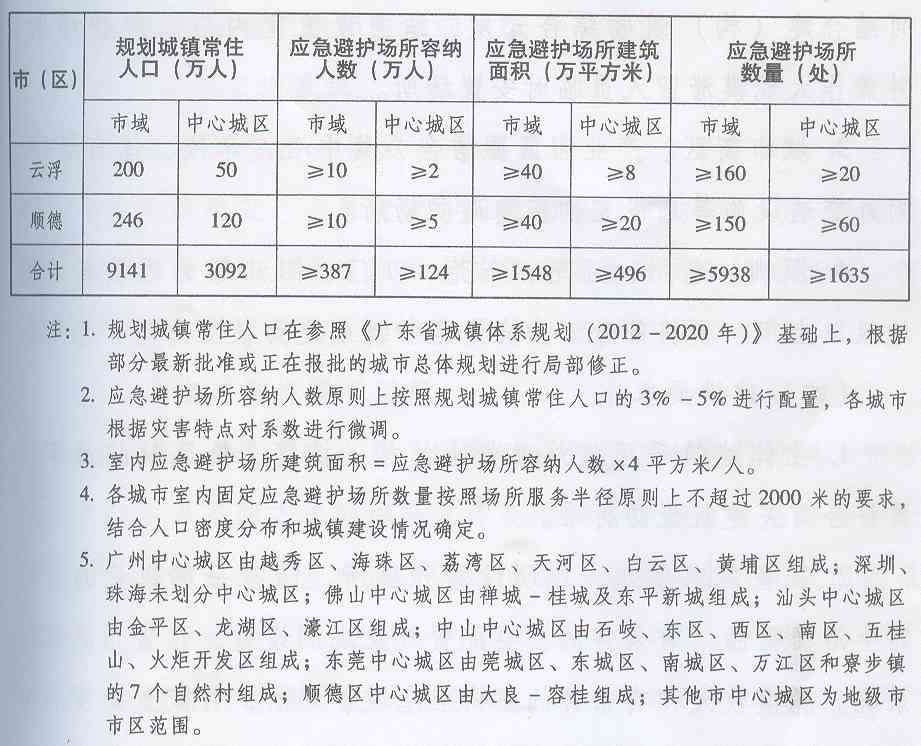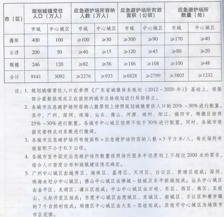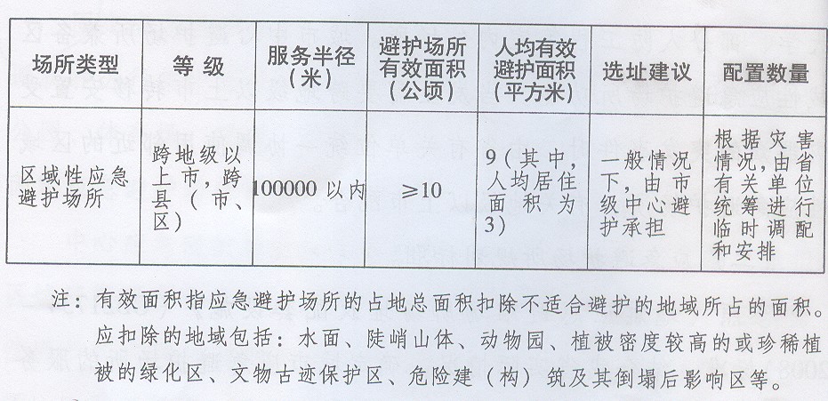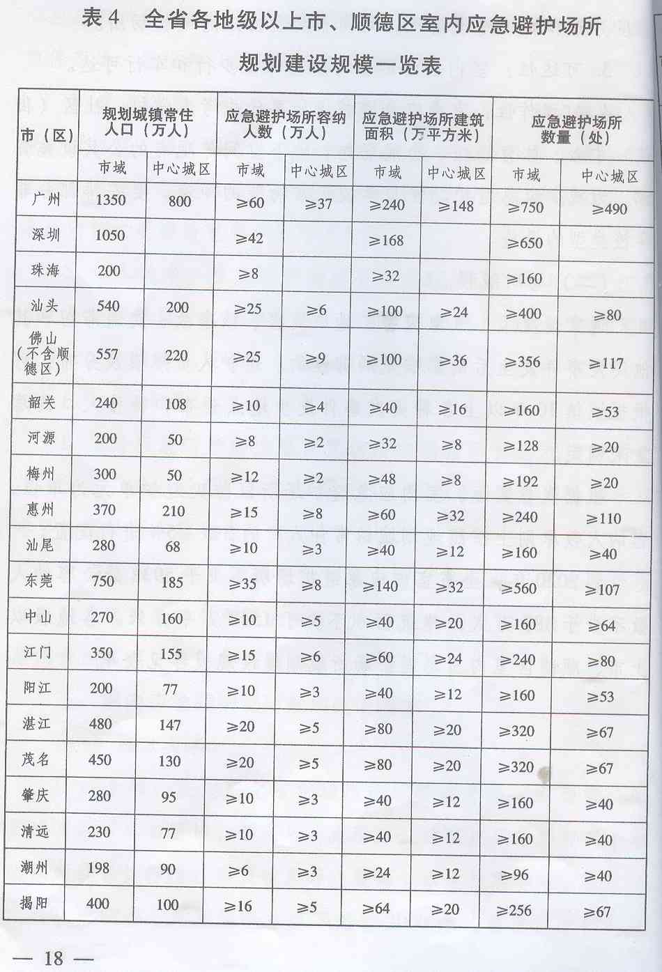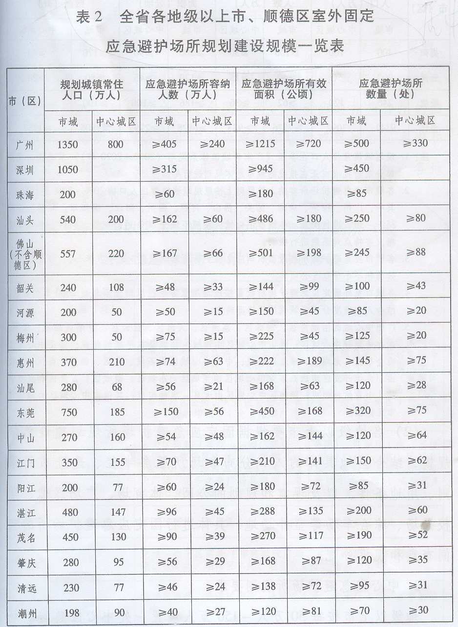 (四)建設(shè)要求。 1.科學選址。應(yīng)急避護場所要避開可能發(fā)生各類地質(zhì)災(zāi)害以及次生災(zāi)害的地區(qū);遠離水庫泄洪區(qū)、洪水泛濫區(qū)、低洼地易積水地區(qū);周邊建筑要滿足抗震、防風等防災(zāi)要求,并預(yù)留防護距離。所有應(yīng)急避護場所建設(shè)要進行嚴格的場所安全性評價,尤其要根據(jù)其應(yīng)對災(zāi)種進行針對性的安全評價,并根據(jù)評價結(jié)果采取必要的防護措施或選擇其他替代場所。 2.分區(qū)合理。工程處理后地形坡度不宜大于7度,植被要以疏林、草地為主,易于搭建帳篷及臨時建筑,適宜根據(jù)承擔功能劃定棚宿區(qū)、應(yīng)急指揮區(qū)、救援隊伍駐扎區(qū)、應(yīng)急醫(yī)療區(qū)、物資儲備區(qū)等功能分區(qū)。 3.配套齊全。應(yīng)急避護場所要配置指揮管理、應(yīng)急供水、供電、廁所、消防、排污、垃圾儲運、醫(yī)療救護及防疫、物資儲備、洗浴、信息發(fā)布等設(shè)施,必要時,要增設(shè)氣象觀測設(shè)施。中心應(yīng)急避護場所除配置固定應(yīng)急避護場所必需設(shè)施外,要設(shè)置應(yīng)急停車場、停機坪、救援部隊駐扎營地等。 4.交通暢通。室外應(yīng)急避護場所人員出入口與車輛出入口要分開設(shè)置,最少要有方向不同的兩條或以上與外界相通的疏散通道。其中,固定應(yīng)急避護場所至少要有兩個入口和兩個出口,場所內(nèi)部主要通道寬度不低于35米。 5.以人為本。應(yīng)急避護場所要考慮殘疾人、老年人、傷病員等弱勢群體需要,完善通訊、廣播、醫(yī)療救護功能,進行無障礙設(shè)計,如坡道化設(shè)計、安排無障礙廁位等。 (五)標識系統(tǒng)。 1.室外應(yīng)急避護場所要設(shè)置場所內(nèi)部指示標志和場所周邊指示標志。標志樣式、顏色等內(nèi)容詳見附件2。場所周邊指示標志要標明場所名稱和類型。 2.室外應(yīng)急避護場所出入口等位置,要標明應(yīng)急避護場所適用的災(zāi)害類型及所承擔的主要功能。室外固定應(yīng)急避護場所要繪制責任區(qū)域分布圖和內(nèi)部功能分區(qū)圖。 五、室內(nèi)應(yīng)急避護場所規(guī)劃建設(shè)要求 (一)選址要求。 1.安全性:室內(nèi)應(yīng)急避護場所選址要避開地震斷裂帶、地質(zhì)災(zāi)害區(qū)、內(nèi)澇區(qū)域,遠離各類危險源;建筑抗風等級要高于本地風荷載設(shè)計標準;建筑抗震等級要高于本地抗震標準。 2.均衡性:按照服務(wù)半徑不超過2000米的要求,結(jié)合人口密度分布和城鎮(zhèn)建設(shè)情況,均衡布局室內(nèi)應(yīng)急避護場所。 3.可達性:室內(nèi)應(yīng)急避護場所要保證步行和車行可達。 4.可操作性:室內(nèi)應(yīng)急避護場所要優(yōu)先考慮學校、社區(qū)(街鎮(zhèn))中心、體育場館、會展場館、地下空間等現(xiàn)有的公共設(shè)施資源。為減少應(yīng)急避護功能與學校正常功能的沖突,要安排部分非學校類型的設(shè)施。 (二)場所規(guī)模。 通常情況下,氣象災(zāi)害、地質(zhì)災(zāi)害、核事故、交通滯留和其他突發(fā)事件發(fā)生后的影響是局部性的。避護人員規(guī)模及分布,可根據(jù)城鎮(zhèn)10年以上各種突發(fā)事件發(fā)生地點分布和轉(zhuǎn)移人口的總量來確定。 根據(jù)我省實際,室內(nèi)應(yīng)急避護場所以防災(zāi)避護單元為單位,容納人數(shù)原則上按照規(guī)劃城鎮(zhèn)常住人口的3%-5%進行配置。 到2020年,全省室內(nèi)應(yīng)急避護場所不少于5938處,容納人數(shù)不少于387萬人,建筑面積不少于1548萬平方米。各地級以上市、順德區(qū)室內(nèi)應(yīng)急避護場所規(guī)劃建設(shè)規(guī)模詳見表4。 表4全省各地級以上市、順德區(qū)室內(nèi)應(yīng)急避護場所規(guī)劃建設(shè)規(guī)模一覽表 ?