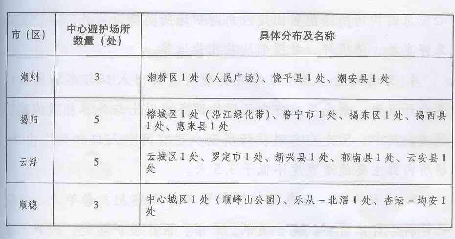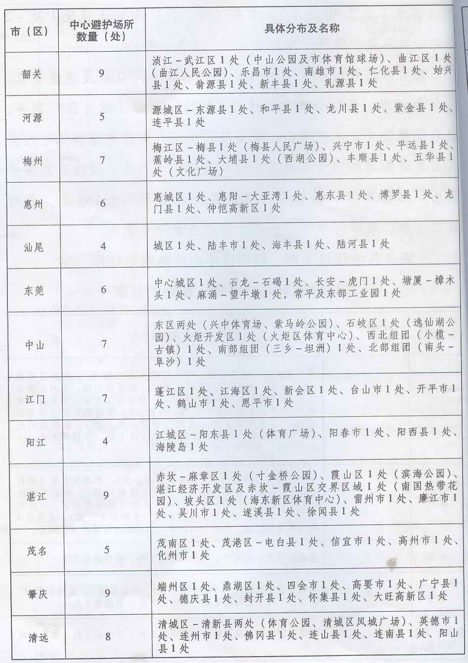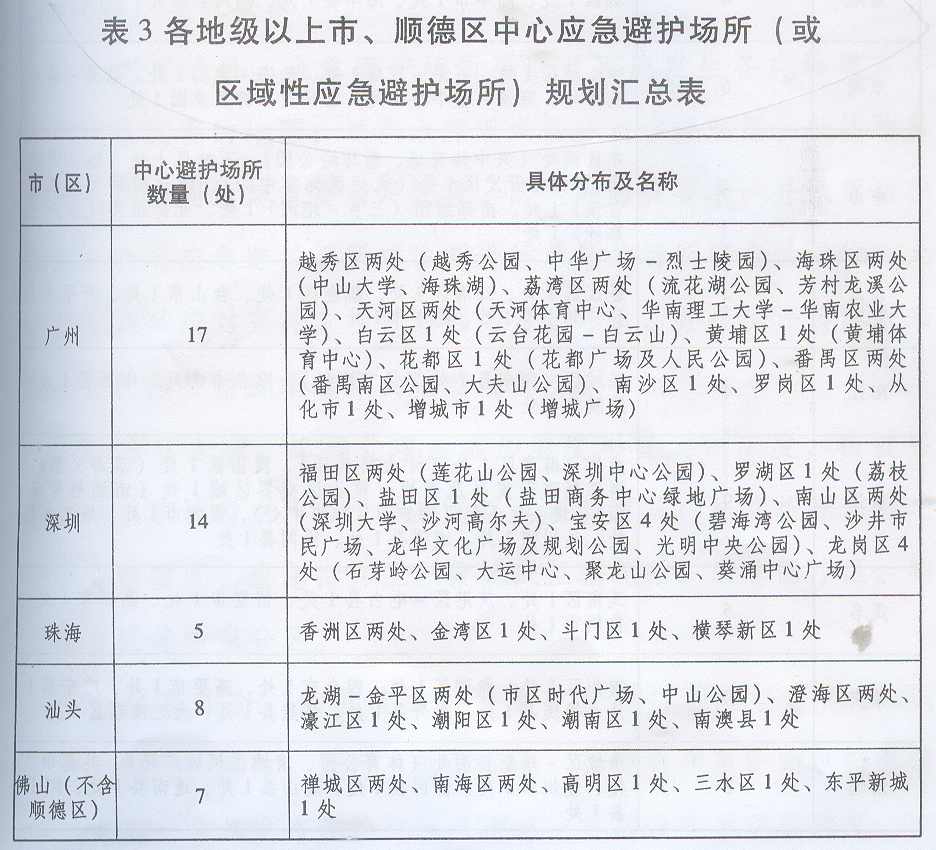 (2)各地級以上市要根據(jù)固定應(yīng)急避護場所規(guī)劃建設(shè)總體規(guī)模,結(jié)合當?shù)鼐唧w的人口分布和場所服務(wù)半徑、選址布局原則、用地條件,以及現(xiàn)有和規(guī)劃的公園、體育場、廣場綠地、學校操場、綜合車場等室外場地,具體進行固定應(yīng)急避護場所的空間布點和規(guī)模分配。 3.中心應(yīng)急避護場所規(guī)劃要求。 地級以上市按每50萬人-150萬人設(shè)置一處中心應(yīng)急避護場所(占地不小于10公頃),各縣(市、區(qū))原則上設(shè)置1處-2處中心應(yīng)急避護場所(每處占地不小于5公頃)。 綜合考慮地級以上市的行政區(qū)劃、服務(wù)人口以及救援要求,結(jié)合縣(市、區(qū))分布和城鎮(zhèn)內(nèi)部的功能組團(或片區(qū))劃分,選取規(guī)模較大、功能較全、安全度較高,具有應(yīng)急指揮作用的固定應(yīng)急避護場所作為各城市中心應(yīng)急避護場所或區(qū)域性應(yīng)急避護場所。到2020年,全省中心應(yīng)急避護場所不少于153處,各地級以上市、順德區(qū)中心應(yīng)急避護場所數(shù)量詳見表3。 表3各地級以上市、順德區(qū)中心應(yīng)急避護場所(或 區(qū)域性應(yīng)急避護場所)規(guī)劃匯總表 ?