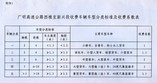 粵交費〔2013〕1301號請示收悉。省人民政府同意廣明高速公路更樓至新興段(廣明高速公路延長線)交工驗收通車和收費站收費設施經(jīng)驗收符合省聯(lián)網(wǎng)收費技術要求后開始收費,收費車型按全省高速公路統(tǒng)一標準,即按車輛軸(輪)數(shù)及車頭高度等物理參數(shù)進行分類,一至五類車的收費系數(shù)分別為1、1.5、2、3、3.5;收費標準為0.6元/標準車公里。