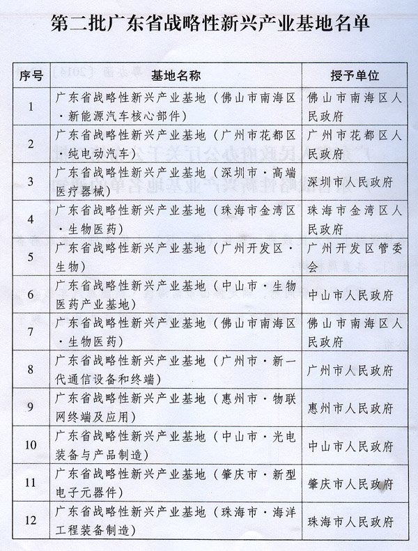 廣東省人民政府辦公廳關(guān)于公布第二批 廣東省戰(zhàn)略性新興產(chǎn)業(yè)基地名單的通知