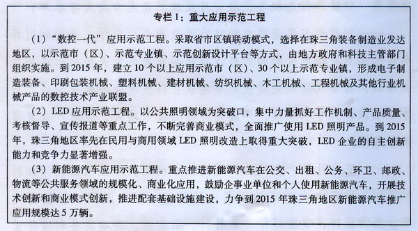 ?。ㄒ唬┩七M重大科技成果推廣應(yīng)用。(省科技廳牽頭,省發(fā)展改革委、經(jīng)濟和信息化委、住房城鄉(xiāng)建設(shè)廳及珠三角九市政府等參與) ——深入開展商業(yè)模式創(chuàng)新,省市聯(lián)動組織實施一批重大項目和新產(chǎn)品示范應(yīng)用工程,引導(dǎo)各市積極開展重大科技成果推廣應(yīng)用示范試點,重點在高端新型電子信息、半導(dǎo)體照明(LED)產(chǎn)品、建筑節(jié)能與綠色建筑技術(shù)和產(chǎn)品、“數(shù)控一代”機械產(chǎn)品、新能源汽車等領(lǐng)域?qū)嵤┦痉锻茝V工程(專欄1);舉辦科技成果與產(chǎn)業(yè)對接活動,推動創(chuàng)新成果加速產(chǎn)業(yè)化,加快重大科技成果產(chǎn)業(yè)化進程。