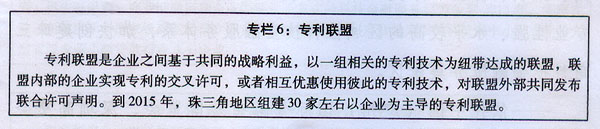 ?。ㄒ唬┥钊雽嵤┲R產(chǎn)權(quán)戰(zhàn)略。(省知識產(chǎn)權(quán)局牽頭,省科技廳、質(zhì)監(jiān)局及珠三角九市政府等參與) ——推進知識產(chǎn)權(quán)的創(chuàng)造與使用。加快實施戰(zhàn)略性新興產(chǎn)業(yè)自主創(chuàng)新工程及重大專利技術(shù)與產(chǎn)業(yè)化計劃,推進專業(yè)鎮(zhèn)知識產(chǎn)權(quán)專項行動,完善知識產(chǎn)權(quán)評估交易機制,探索實施重大項目的知識產(chǎn)權(quán)評議制度,加快形成一批具有自主知識產(chǎn)權(quán)的產(chǎn)業(yè)和產(chǎn)品。推動珠三角各行業(yè)建立跨行政區(qū)域的知識產(chǎn)權(quán)保護聯(lián)盟,加快發(fā)展專利聯(lián)盟(專欄6),構(gòu)建重點產(chǎn)業(yè)專利池,貫徹企業(yè)知識產(chǎn)權(quán)管理規(guī)范,提升企業(yè)專利運用和管理水平。