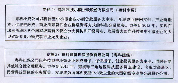 (二)引導(dǎo)發(fā)展科技信貸。(省科技廳牽頭,省財政廳、金融辦及珠三角九市政府等參與) ——強化廣州、深圳、東莞、佛山市科技和金融結(jié)合試點的輻射帶動作用,促進各市發(fā)展新型科技金融機構(gòu);鼓勵各市設(shè)立政府科技貸款風(fēng)險補償金和科技貸款貼息資金,引導(dǎo)各類金融機構(gòu)創(chuàng)新科技型企業(yè)貸款模式、產(chǎn)品和服務(wù)。支持粵科科技小額貸款公司、粵科融資擔保公司(專欄4、5)在珠三角高新區(qū)、專業(yè)鎮(zhèn)與當?shù)卣献髟O(shè)立子公司、分支機構(gòu),吸引社會資本,搭建覆蓋高新區(qū)和專業(yè)鎮(zhèn)的業(yè)務(wù)網(wǎng)絡(luò)平臺。積極開展知識產(chǎn)權(quán)投融資服務(wù),推動科技保險產(chǎn)品創(chuàng)新和科技擔保業(yè)務(wù)發(fā)展,提高科技信貸水平,形成科技金融產(chǎn)業(yè)發(fā)展新格局。