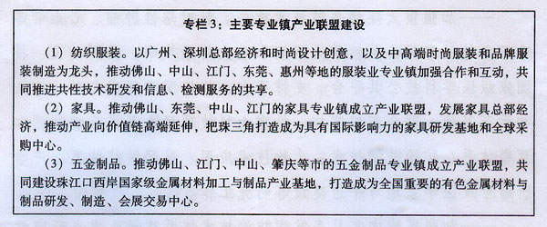 ?。ㄈ┩苿訉I(yè)鎮(zhèn)協(xié)同升級。(省科技廳牽頭,省經(jīng)濟和信息化委及珠三角九市政府等參與) ——發(fā)展專業(yè)鎮(zhèn)產(chǎn)業(yè)聯(lián)盟。支持各市專業(yè)鎮(zhèn)在家具、家電、紡織服裝等特色優(yōu)勢產(chǎn)業(yè)重要環(huán)節(jié)加強合作與交流,促進專業(yè)分工和產(chǎn)業(yè)鏈延伸,形成專業(yè)鎮(zhèn)產(chǎn)業(yè)發(fā)展聯(lián)盟(專欄3)。
