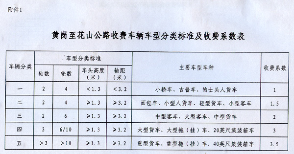 粵交費〔2014〕1455號請示收悉。同意黃崗至花山公路建成通車和收費站收費設(shè)施經(jīng)驗收符合省聯(lián)網(wǎng)收費技術(shù)要求后開始收費,收費車型按全省高速公路統(tǒng)一標(biāo)準(zhǔn),即按車輛軸(輪)數(shù)及車頭高度等物理參數(shù)進(jìn)行分類,一至五類車的收費系數(shù)分別為1、1.5、2、3、3.5;收費標(biāo)準(zhǔn)為0.6元/標(biāo)準(zhǔn)車公里。