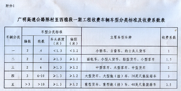 粵交費(fèi)〔2014〕1681號請示收悉。同意廣明高速公路陳村至西樵段一期工程建成通車和收費(fèi)站收費(fèi)設(shè)施經(jīng)驗(yàn)收符合省聯(lián)網(wǎng)收費(fèi)技術(shù)要求后開始收費(fèi),收費(fèi)車型按全省高速公路統(tǒng)一標(biāo)準(zhǔn),即按車輛軸(輪)數(shù)及車頭高度等物理參數(shù)進(jìn)行分類,一至五類車的收費(fèi)系數(shù)分別為1、1.5、2、3、3.5,收費(fèi)標(biāo)準(zhǔn)為0.6元/標(biāo)準(zhǔn)車公里。