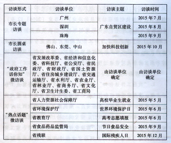 ?。ㄈ┘訌?qiáng)宣傳,增強(qiáng)實(shí)效。通過政府網(wǎng)站、平面媒體和新媒體發(fā)布訪談?lì)A(yù)告及訪談內(nèi)容。省政府門戶網(wǎng)站策劃推出“2015年政府工作話你知”、“廣東推進(jìn)自貿(mào)區(qū)建設(shè)”等專題,整理匯總訪談圖文實(shí)錄以及有關(guān)政策文件、工作動(dòng)態(tài)、媒體報(bào)道等內(nèi)容,方便公眾全方位了解相關(guān)工作。