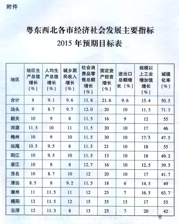 附件:粵東西北各市經(jīng)濟(jì)社會發(fā)展主要指標(biāo)2015年預(yù)期目標(biāo)表
