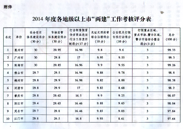 按照省委、省政府關(guān)于加強(qiáng)社會(huì)信用體系建設(shè)和市場(chǎng)監(jiān)管體系建設(shè)(以下簡(jiǎn)稱(chēng)“兩建”)工作部署和《2014年度廣東省社會(huì)信用體系建設(shè)和市場(chǎng)監(jiān)管體系建設(shè)工作考核方案》要求,省“兩建”工作領(lǐng)導(dǎo)小組辦公室牽頭組織省有關(guān)單位對(duì)各地級(jí)以上市政府“兩建”工作進(jìn)行了考核。經(jīng)綜合評(píng)定,21個(gè)地級(jí)以上市考核全部合格,其中,惠州、廣州、珠海市成績(jī)顯著。經(jīng)省人民政府同意,現(xiàn)將全省“兩建”工作情況通報(bào)如下: