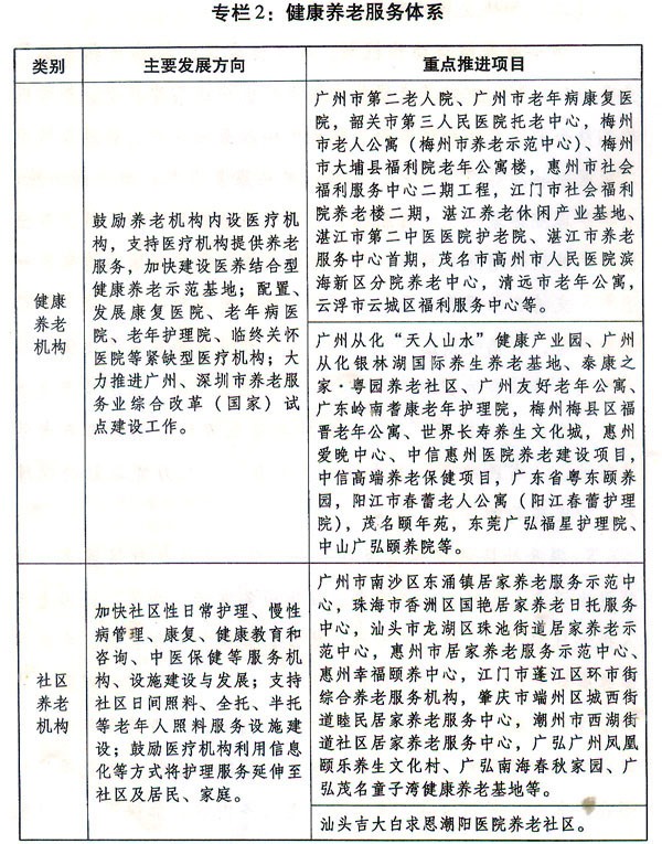 (二)加快發(fā)展健康養(yǎng)老服務(wù)。 7.健全醫(yī)養(yǎng)結(jié)合協(xié)作機(jī)制。建立健全醫(yī)療機(jī)構(gòu)與養(yǎng)老機(jī)構(gòu)業(yè)務(wù)協(xié)作機(jī)制,支持養(yǎng)老機(jī)構(gòu)內(nèi)設(shè)醫(yī)療機(jī)構(gòu)或構(gòu)建養(yǎng)老、護(hù)理機(jī)構(gòu)相結(jié)合的醫(yī)養(yǎng)綜合體,符合規(guī)定的納入醫(yī)保定點(diǎn)。鼓勵(lì)以城市二級(jí)醫(yī)院轉(zhuǎn)型等多種方式,配置、發(fā)展康復(fù)醫(yī)院、老年病醫(yī)院、老年護(hù)理院等緊缺型醫(yī)療機(jī)構(gòu),形成規(guī)模適宜、功能互補(bǔ)、安全便捷的健康養(yǎng)老服務(wù)網(wǎng)絡(luò),提供方便快捷、優(yōu)先優(yōu)惠的老年醫(yī)療服務(wù)。支持公立醫(yī)院以及社區(qū)醫(yī)療機(jī)構(gòu)設(shè)置老年人醫(yī)療康復(fù)護(hù)理專業(yè)科室,大幅提高二級(jí)以上綜合醫(yī)院開(kāi)設(shè)老年病科的比例,著力增強(qiáng)醫(yī)養(yǎng)結(jié)合的養(yǎng)老服務(wù)能力。大力推進(jìn)廣州、深圳市養(yǎng)老服務(wù)業(yè)綜合改革(國(guó)家)試點(diǎn),加快建設(shè)醫(yī)養(yǎng)結(jié)合型健康養(yǎng)老示范基地。(省民政廳、衛(wèi)生計(jì)生委負(fù)責(zé),省人力資源社會(huì)保障廳、中醫(yī)藥局參與)