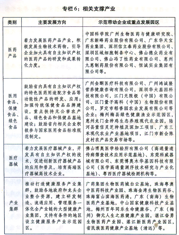 21.切實(shí)推動(dòng)健康服務(wù)產(chǎn)業(yè)集聚發(fā)展??茖W(xué)規(guī)劃、因勢(shì)利導(dǎo),打造健康服務(wù)產(chǎn)業(yè)集群,鼓勵(lì)各地政府和龍頭企業(yè)整合健康服務(wù)產(chǎn)業(yè)資源,打造研發(fā)制造、流通應(yīng)用、管理服務(wù)一體化全產(chǎn)業(yè)鏈的大型健康產(chǎn)業(yè)集團(tuán),支持有條件的地區(qū)設(shè)立健康服務(wù)產(chǎn)業(yè)示范園區(qū)。珠三角地區(qū)突出高端引領(lǐng),以智能化、網(wǎng)絡(luò)化、移動(dòng)化為方向,有效提升以現(xiàn)代醫(yī)療器械、康復(fù)裝備和健康智能終端裝備等為重點(diǎn)的醫(yī)療保健裝備和高新診療技術(shù)水平,推動(dòng)生物醫(yī)藥、醫(yī)療器械企業(yè)向高端醫(yī)療技術(shù)服務(wù)領(lǐng)域拓展延伸,培育發(fā)展生物醫(yī)用材料制品及植入器械、新型高端耗材及制品、康復(fù)器械等優(yōu)勢(shì)特色產(chǎn)業(yè);積極發(fā)展電子醫(yī)藥商務(wù),打造醫(yī)療器械設(shè)備和醫(yī)藥產(chǎn)品展覽交易平臺(tái)?;洊|西北地區(qū)依托現(xiàn)有基礎(chǔ)和優(yōu)勢(shì),以中西制藥、診療設(shè)備、養(yǎng)老保健為方向,重點(diǎn)發(fā)展生物原料藥及制品、現(xiàn)代中藥(特色南藥)及中藥制劑、海洋生物制藥、保健食品和健康飲品以及醫(yī)學(xué)診療設(shè)備等產(chǎn)業(yè),優(yōu)化發(fā)展旅游養(yǎng)生和養(yǎng)老服務(wù)等特色產(chǎn)業(yè)。(省發(fā)展改革委、經(jīng)濟(jì)和信息化委負(fù)責(zé),省科技廳、食品藥品監(jiān)管局、衛(wèi)生計(jì)生委、商務(wù)廳參與)