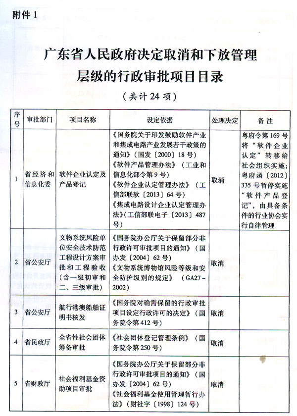 為貫徹落實《國務院關于取消和調整一批行政審批項目等事項的決定》(國發(fā)〔2015〕11號),進一步深化我省行政審批制度改革,經研究論證,省政府決定再取消和下放24項行政審批項目,將3項工商登記前置審批事項改為后置審批。請各地、各部門抓緊做好取消和調整事項的落實和銜接工作,加快配套改革和后續(xù)監(jiān)管制度建設,切實做到放管結合,不斷提高政府管理科學化、規(guī)范化水平。 ? ? ? 廣東省人民政府 2015年8月7日 ? ?