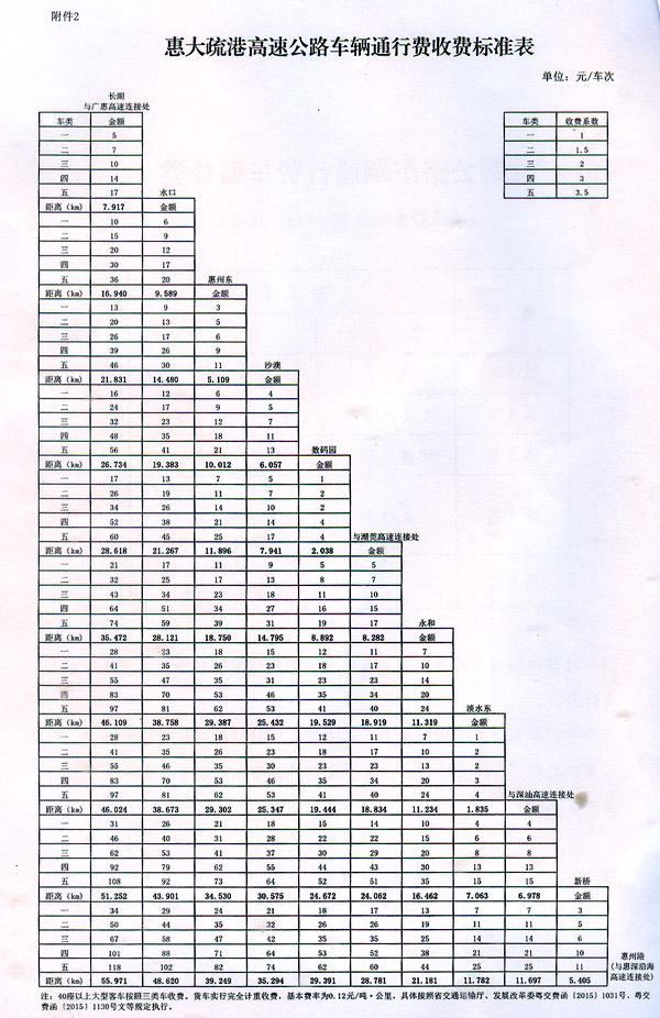 粵交費(fèi)〔2015〕1101號(hào)請(qǐng)示收悉。同意惠大疏港高速公路建成通車(chē)和收費(fèi)站收費(fèi)設(shè)施經(jīng)驗(yàn)收符合省聯(lián)網(wǎng)收費(fèi)技術(shù)要求后開(kāi)始收費(fèi),收費(fèi)車(chē)型按國(guó)家統(tǒng)一標(biāo)準(zhǔn)進(jìn)行分類(lèi),一至五類(lèi)車(chē)的收費(fèi)系數(shù)分別為1、1.5、2、3、3.5,收費(fèi)標(biāo)準(zhǔn)為0.6元/標(biāo)準(zhǔn)車(chē)公里;貨車(chē)實(shí)行完全計(jì)重收費(fèi),基本費(fèi)率為0.12元/噸·公里。